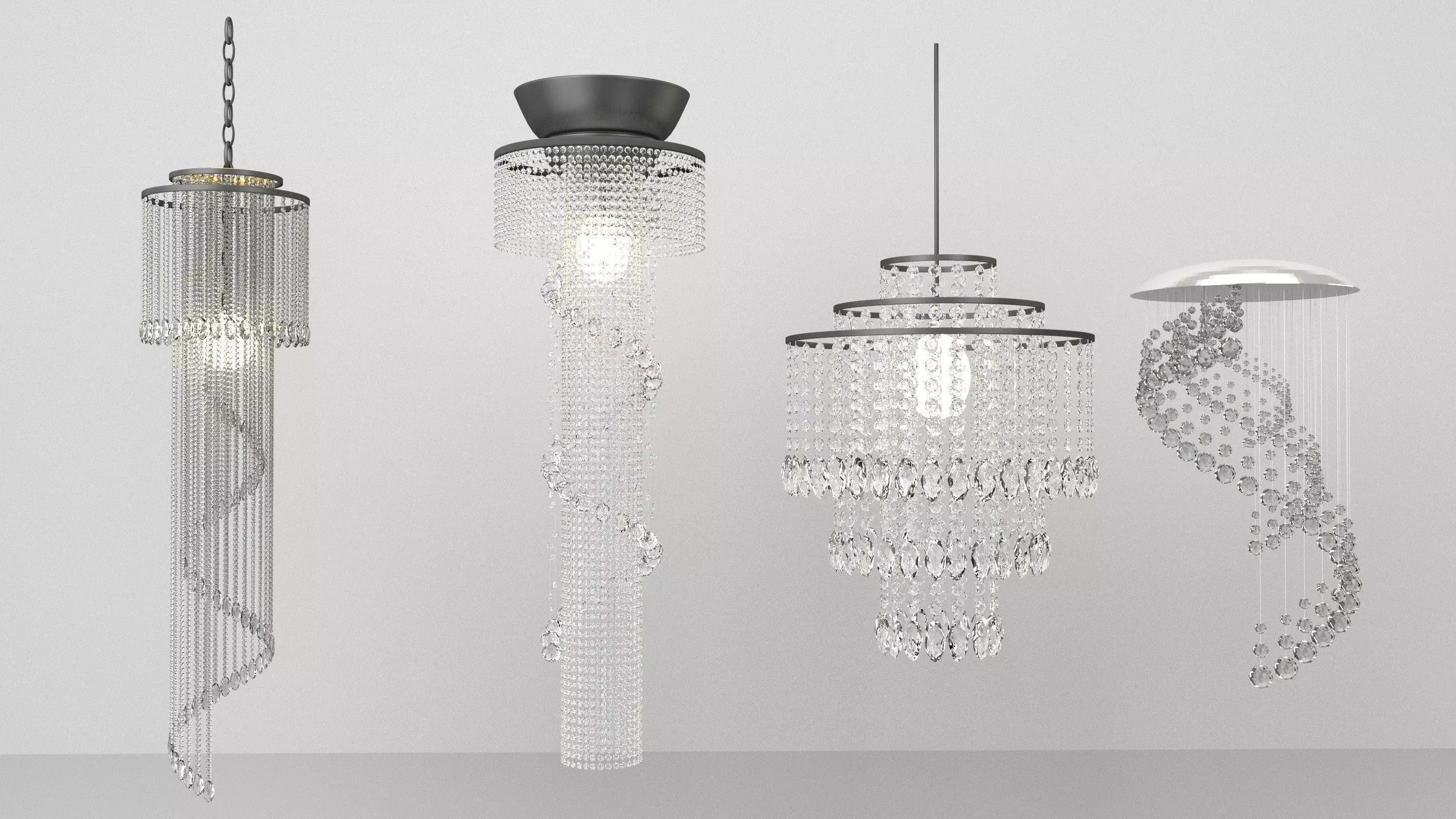 This set consists of four crystal ceiling lights ideal for architectural visualization. These models will look stunning in all kinds of luxury apartments or in art nouveau buildings, expensive hotels and more