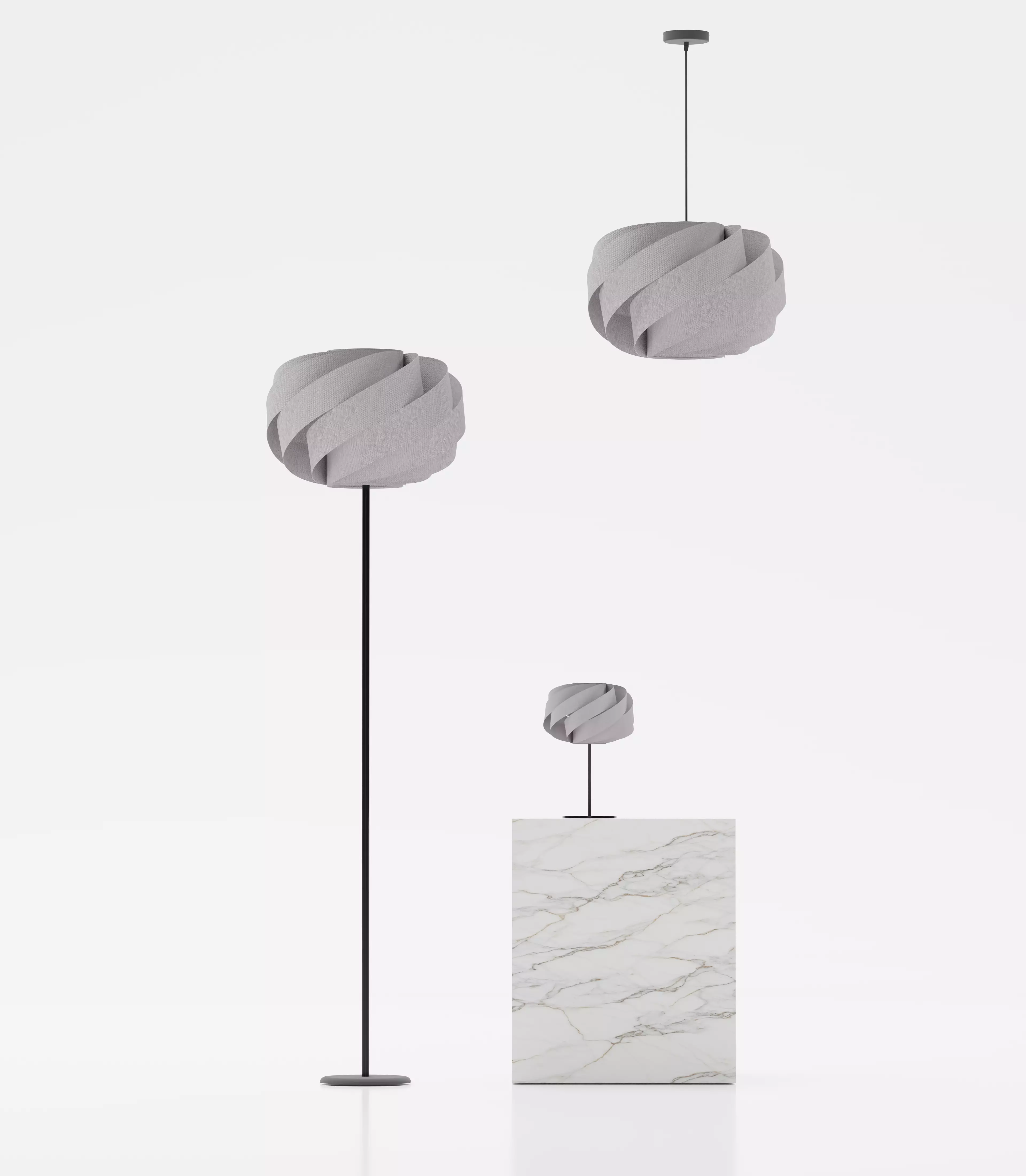 Ideal for architects, interior designers, and 3D professionals, the Spinner lighting family combines textile aesthetics with modern lighting design. The spiral lamella effect creates a striking visual while offering flexibility for customizing finishes and lighting effects, making these models a versatile addition to any space.