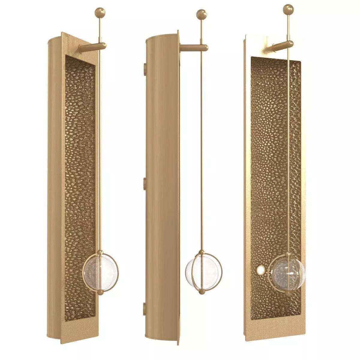 The contemporary VEGA wall light features a glass sphere that softly casts light across an ornamental, embossed interior. The effect is of rays of light refracted through chasing to fill the room with a warming, natural glow.brass brown bronze finish, hammered metal shade , glass globe, pendant , suspend