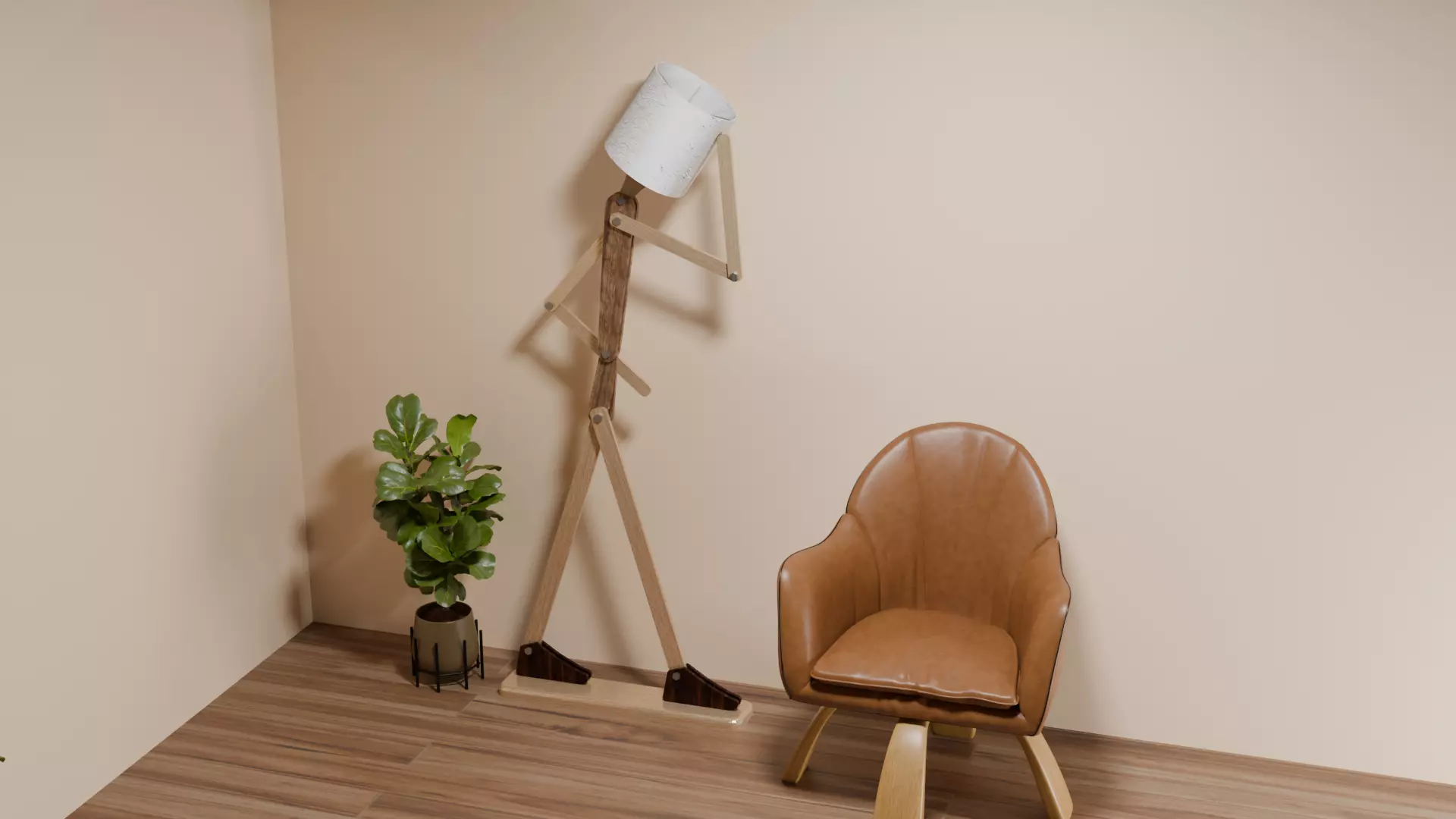 Bring whimsy and modern craftsmanship into your scene with this fully posable human floor lamp. Built like a stylized wooden stick figure, every body part—arms, legs, head, forearms, feet, and torso—is modeled as a separate, movable piece, allowing for expressive posing or custom scene setups. The base, limbs, and head are crafted in light ash wood, the body features warm medium cedar, and the shoes are finished in rich dark walnut for a grounded, artisan contrast. A detailed switch, bale, Edison bulb, and lampshade are included as separate components, giving you full control to remove, swap, or reconfigure them as needed.