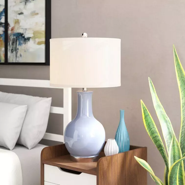 • This versatile curvy Weston Table Lamp brushed nickel details. The hardback drum shade has a white linen fabric.