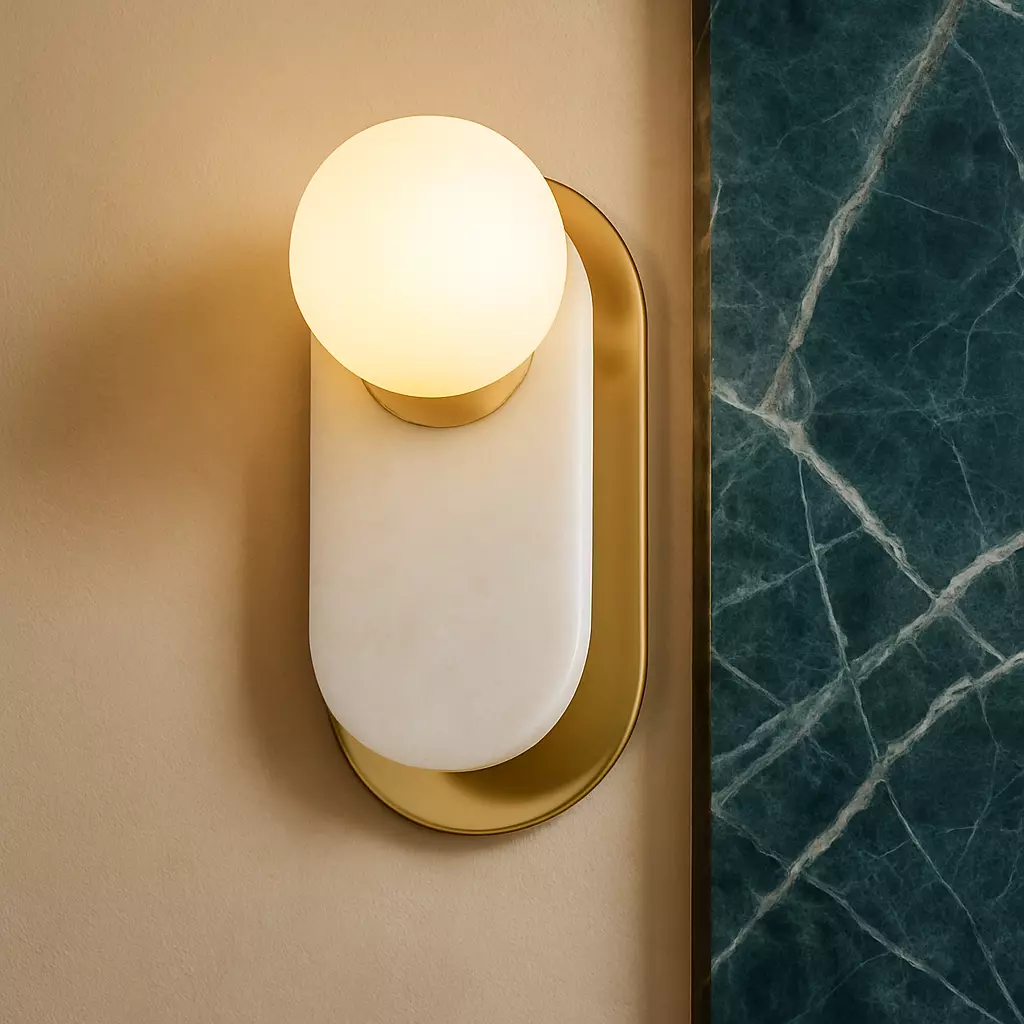 The Zora Wall Sconce is a modern layered lighting fixture featuring an aged brass metal backplate paired with a white Thassos-style marble insert. Its sculptural silhouette and soft globe diffuser give the piece a refined, jewelry-like presence ideal for contemporary interiors.