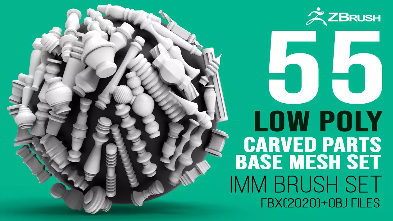 55 Low poly wood carved chair or table leg and pillar, baluster parts, base mesh shapes IMM brush set for Zbrush.