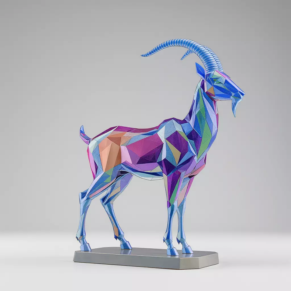 This 3D model of a mountain goat features an abstract design with vibrant, glossy colors, making it perfect for use in artistic projects, digital displays, and modern design environments. The polygonal design, created using intricate geometric shapes and bright colors, makes it a visually captivating and unique piece of art. This model is ideal for applications in digital art projects, interior design, or even as a sculptural piece for exhibitions and galleries.