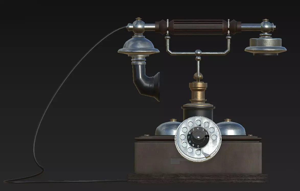 Representation of a telephone from the late nineteenth century, early twentieth century.With an antique and robust wood look and in copper metal.antique bedside phone used or mostly seen in old black and white movies from the early 20th century