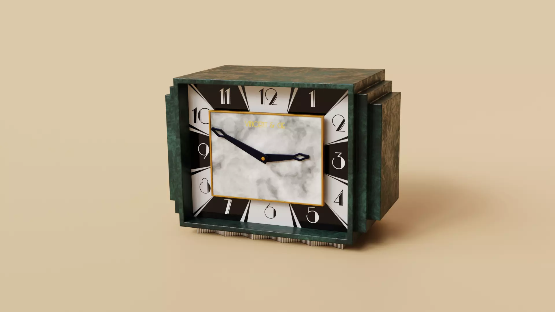 This is a low poly model of an original design of an Art Deco style clock. The clock is made of a block of green stone (nephrite/jade), with a shiny aluminium base, two hands (hour and minute) and a gold-framed white marble plaque in the centre. The model has only 483 polygons and uses 8k textures for albedo, metalness, roughness and normal map. The beveled edges are baked onto the normal map, creating a realistic effect without adding extra geometry. The model is suitable for any game engine or 3D software that supports PBR materials. The model is also UV-unwrapped. The model comes with fbx/gltf/obj files and a .zip file containing the textures.