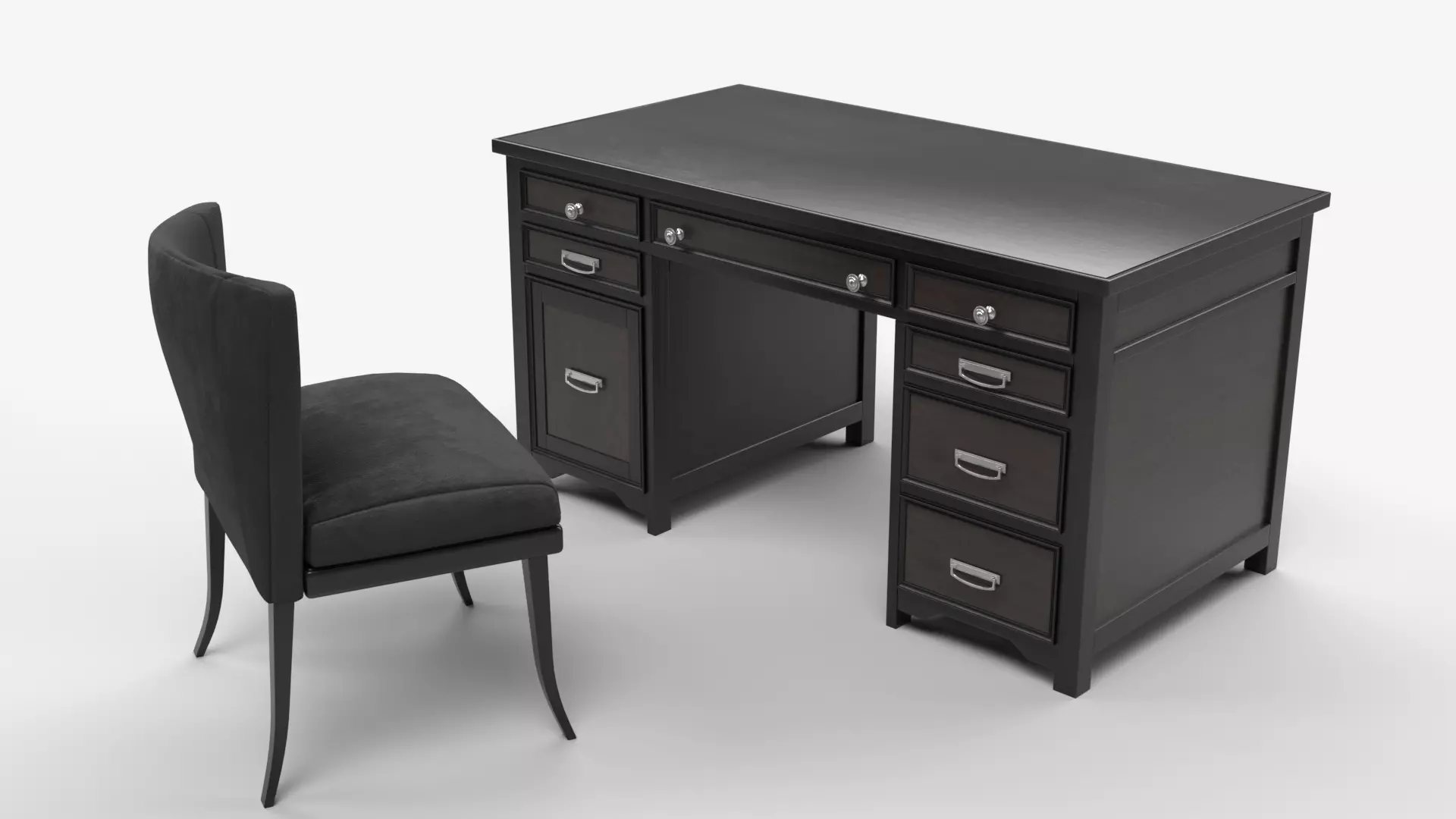 This high-quality 3D model features a classic Black-painted wooden office desk paired with a soft upholstered chair. The desk includes multiple functional drawers with detailed metal handles, offering a realistic and elegant vintage-inspired design.
