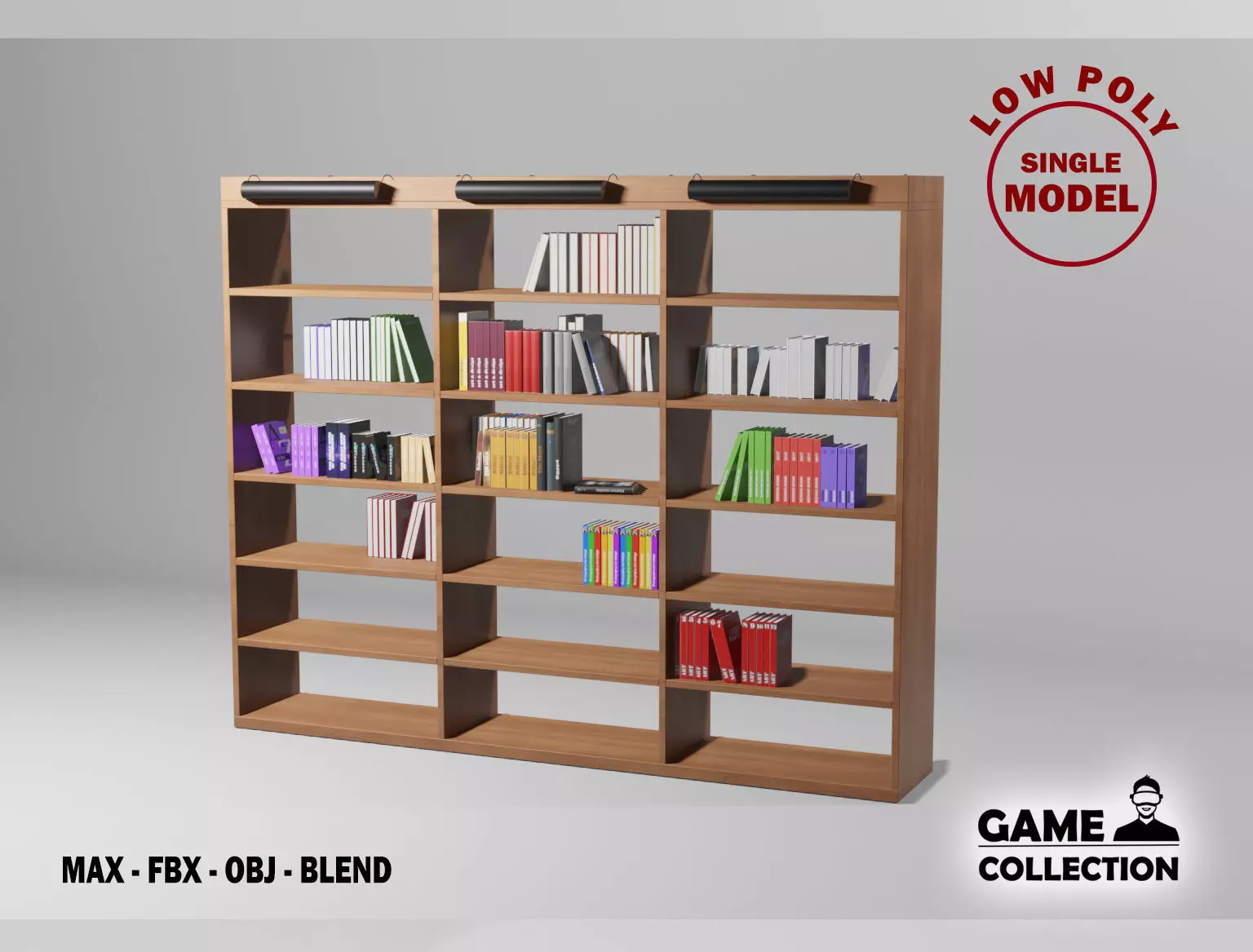 3D model of a bookshelf library with books. The models are low poly to be used for games or applications and 3D scenes that require few polygons. It has been created in different 3D Studio Max versions and also in FBX, OBJ and BLEND.