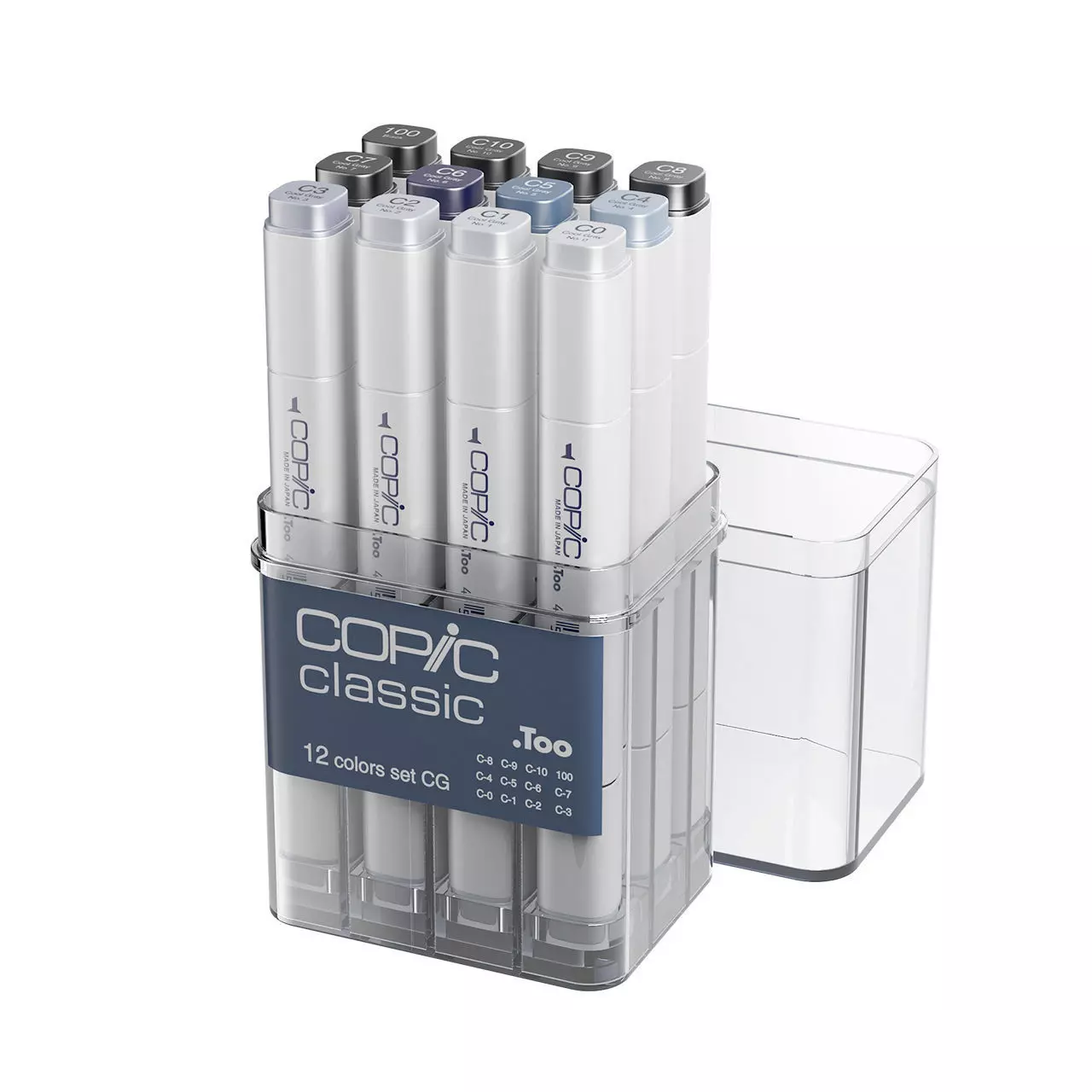 3d model Copic Classic Cool Gray 12PC Set by Copic. The Copic Classic Cool Gray 12PC Set by Copic provides a sophisticated palette of cool grey tones (C-0 through C-10 plus Black) designed specifically for precision shading, layering and professional illustration. Its high-quality alcohol-based ink, replaceable dual nib system and refillable barrels support long-term creative use, while the carefully curated grey spectrum facilitates depth, contrast and subtle transitions in artwork. Ideal for illustrators, graphic designers or professionals working on monochromatic renderings or architectural sketches, it enhances visual clarity and tonal complexity across surfaces and mediums. Dimensions of the set: H 15 x L 11.18 x D 4.32 cm / H 5.9 x L 4.4 x D 1.7 inches. The Vray, Corona, and Blender files come with materials in place, ready to render.