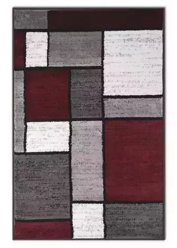The Urbane Grid Area Rug A sophisticated blend of geometric precision and industrial textures. This piece features a bold color-blocking strategy using deep burgundy accents against a balanced palette of slate and charcoal grays. The distressed, stippled texture within the blocks adds visual depth and a soft, organic feel to the rigid rectangular layout. Perfect for modern living rooms or minimalist office spaces.