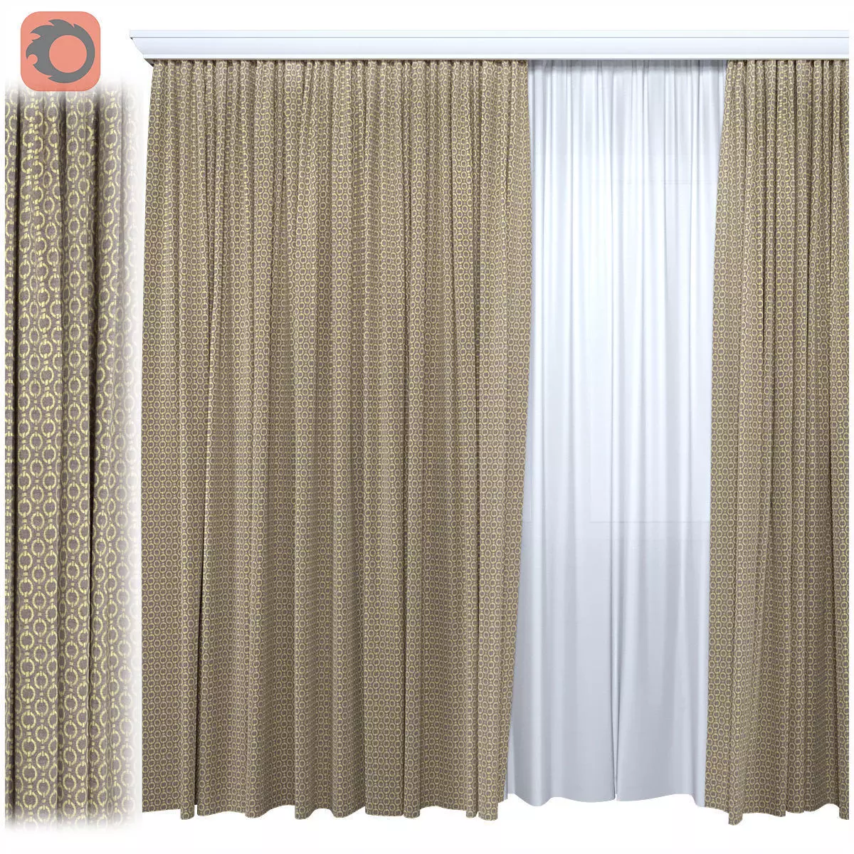 Tightly Woven Fabric curtains, tulle, cornice are present. Suitable for close-up visualization. Excellent for modern or classic interior renderings, bedrooms, living room etc. Width with a cornice - 3 meters All textures in the archive, FBX and the library of materials for Corona render.