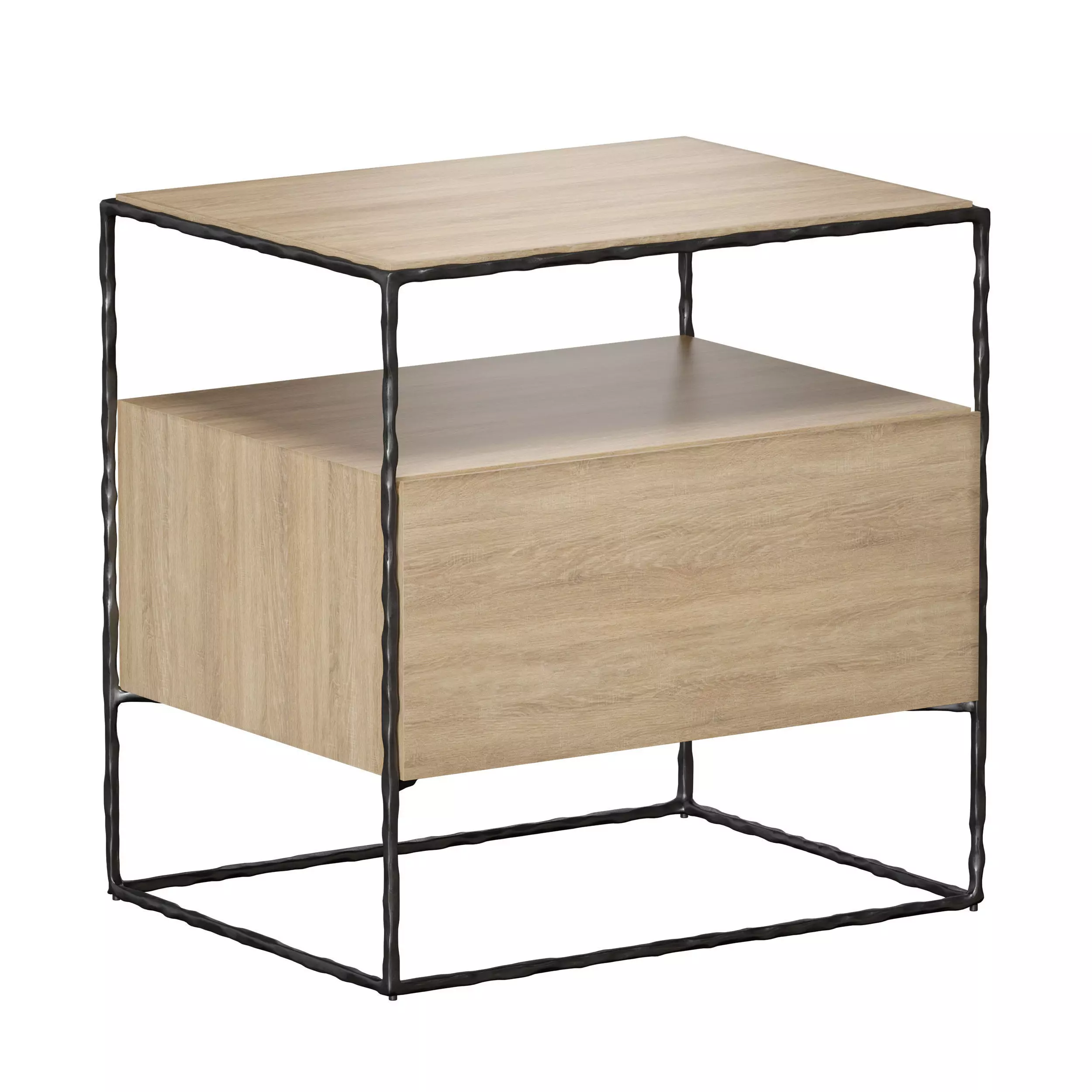 3D model of the Dahlia Large Hand-Forged Steel and Oak Wood Nightstand with Storage (Crate and Barrel). Made from light oak wood. The frame is made of black metal and is stylized as forged.
