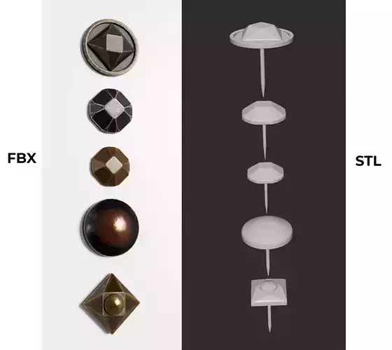 FBX models are optimized low-poly assets (from 288 to 544 polygons). They include only the decorative nail heads, without the nail shaft, making them ideal for real-time applications, props, furniture details, doors, and metal decor elements.