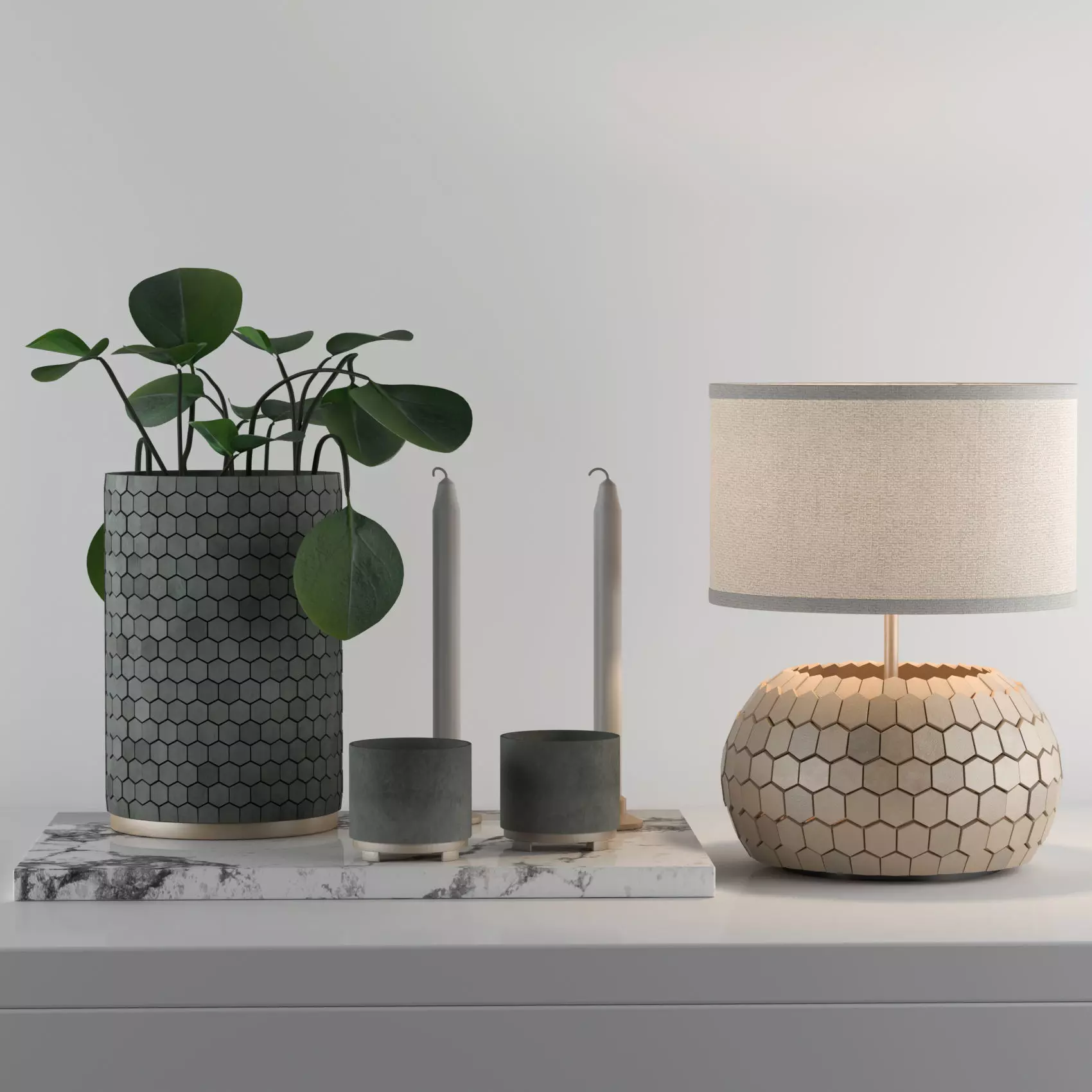 Decor Set With Desert Privet PlantNGon Pot & TableLampPhotography of Two LeavesPolys: 82K