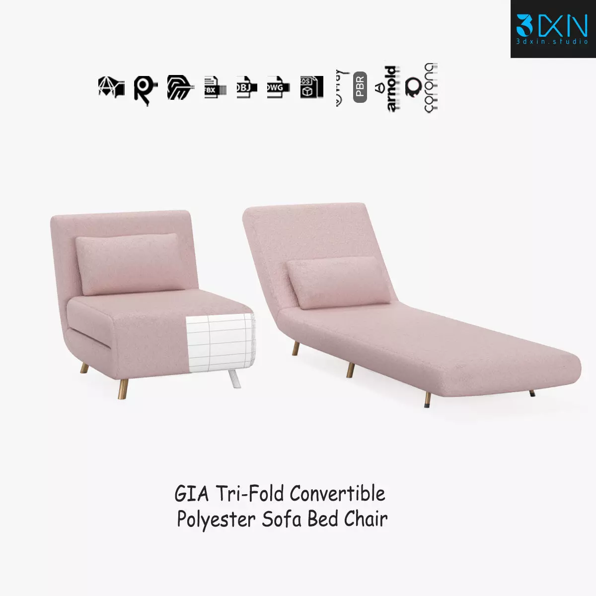 GIA Tri-Fold Convertible Polyester Sofa Bed Chair is a high quality, photo realistic 3d model that will enhance detail and realism to any of your rendering projects. The model has a fully textured, detailed design that allows for close-up renders, and was modeled in 3ds Max 2018 also has 3ds Max 2015 version and rendered with V-Ray. Renders have no post-processing.