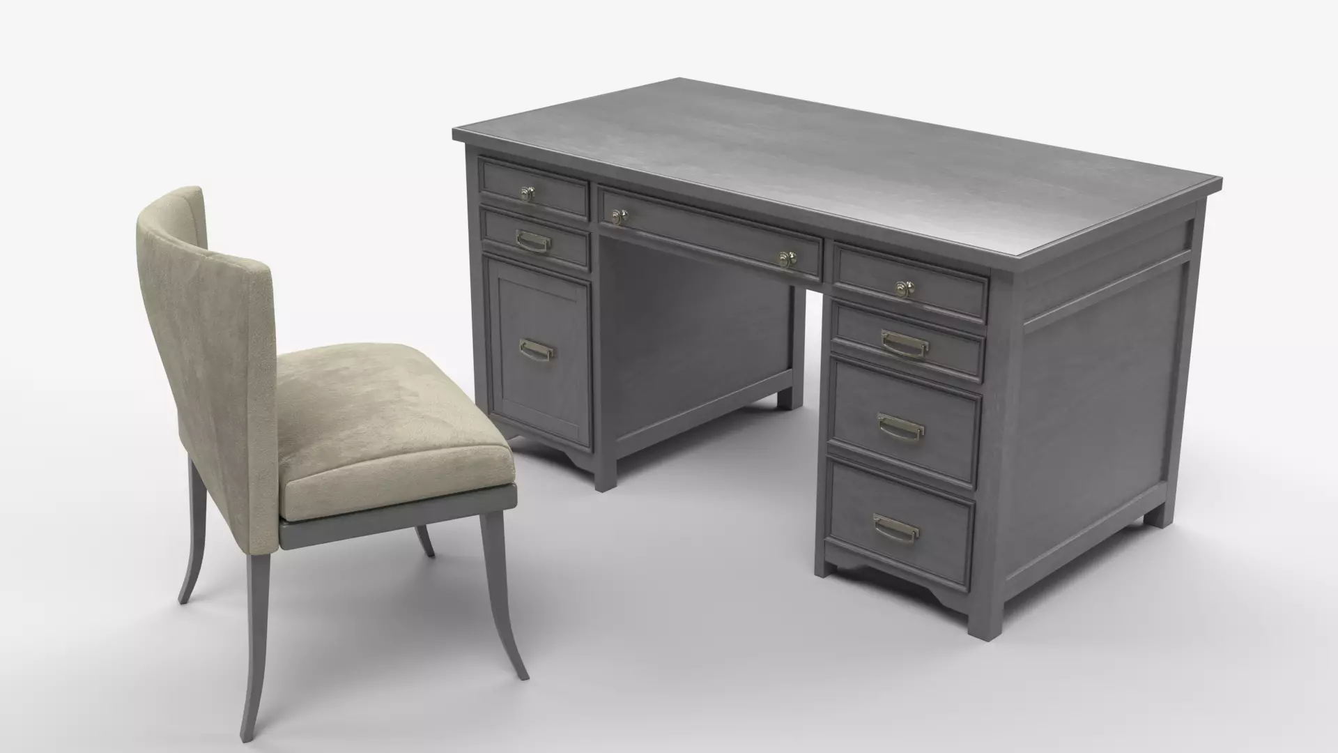 *This high-quality 3D model features a classic Gray-painted wooden office desk paired with a soft upholstered chair. The desk includes multiple functional drawers with detailed metal handles, offering a realistic and elegant vintage-inspired design.*
