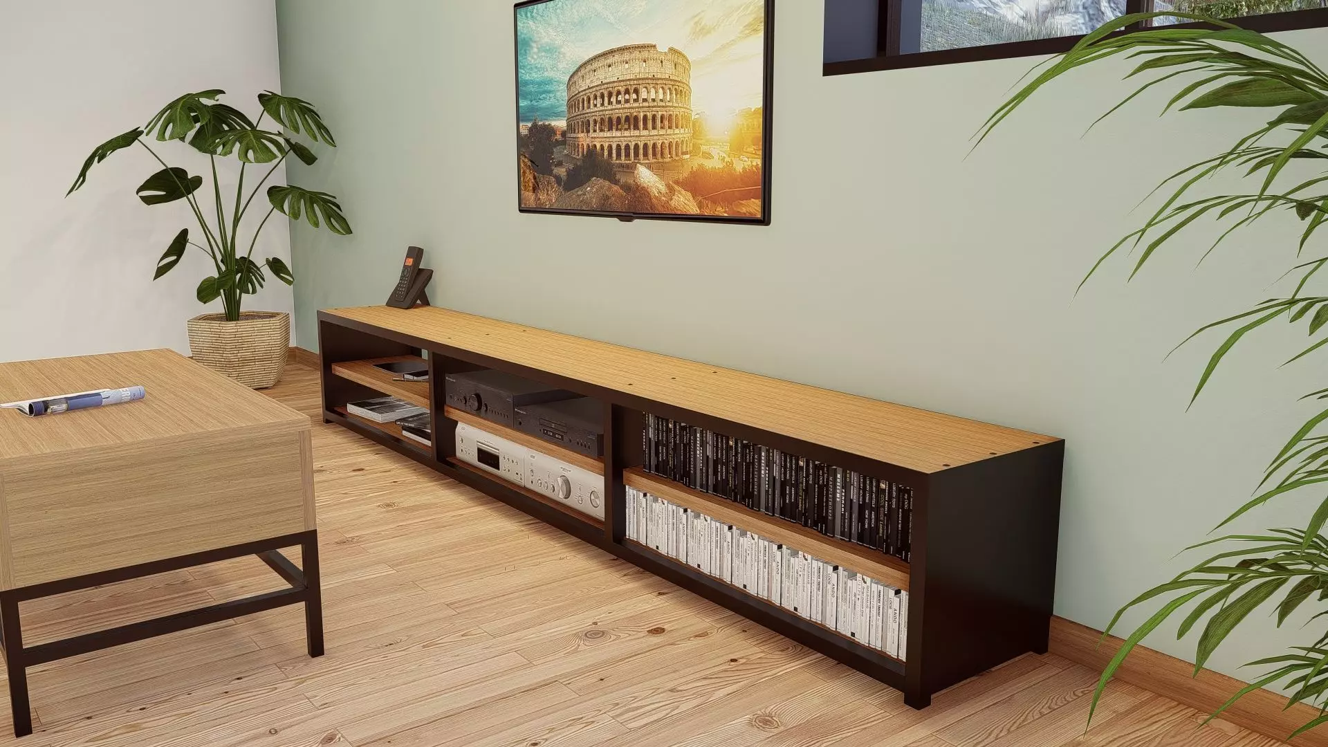 The stand is 300 centimeters long by 41 centimeters large by 45 centimeters high.