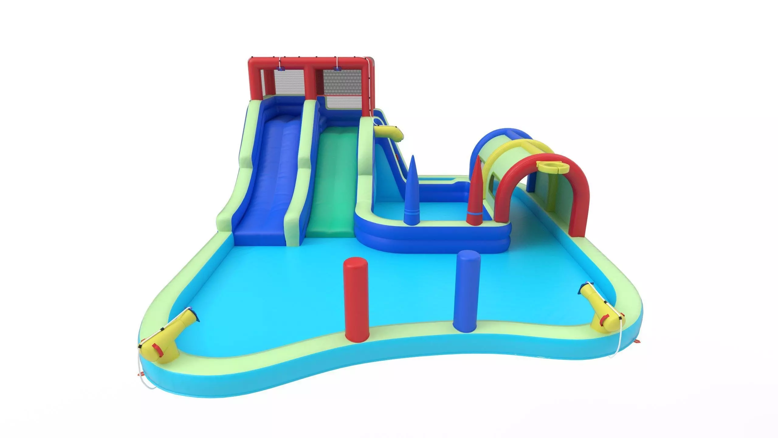 This model features multiple slides, splash pool area, inflatable obstacles, and water spray elements. Ideal for use in architectural visualization, game environments, product visualization, commercials, and animation projects.