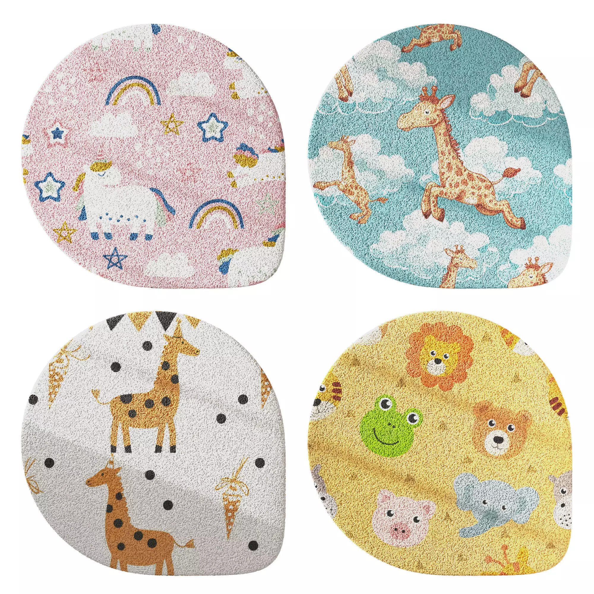 Description:The Kids Carpet Set 21 is a delightful collection of four whimsical rug designs, perfect for brightening up children’s rooms or play areas. Each rug features playful motifs—from unicorns and rainbows to cheerful giraffes, lions, and friendly frogs—adding joy and charm to any interior. The set’s soft, rounded shapes and vibrant colors make it a versatile choice for nurseries, bedrooms, or daycare visualization projects, while its optimized poly count ensures smooth integration into any 3D scene.