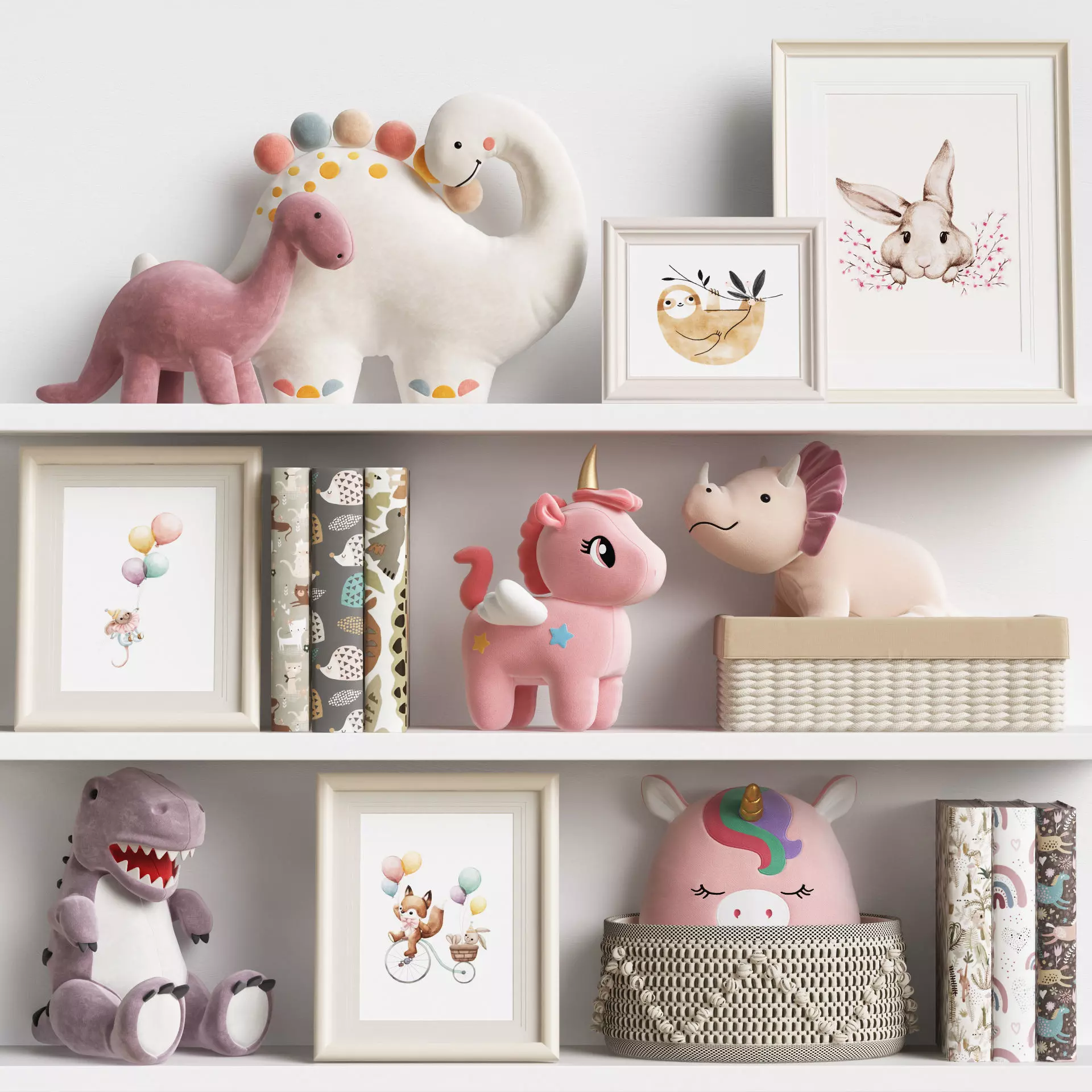 -dinosaurs-unicorn-wicker baskets-books-posters