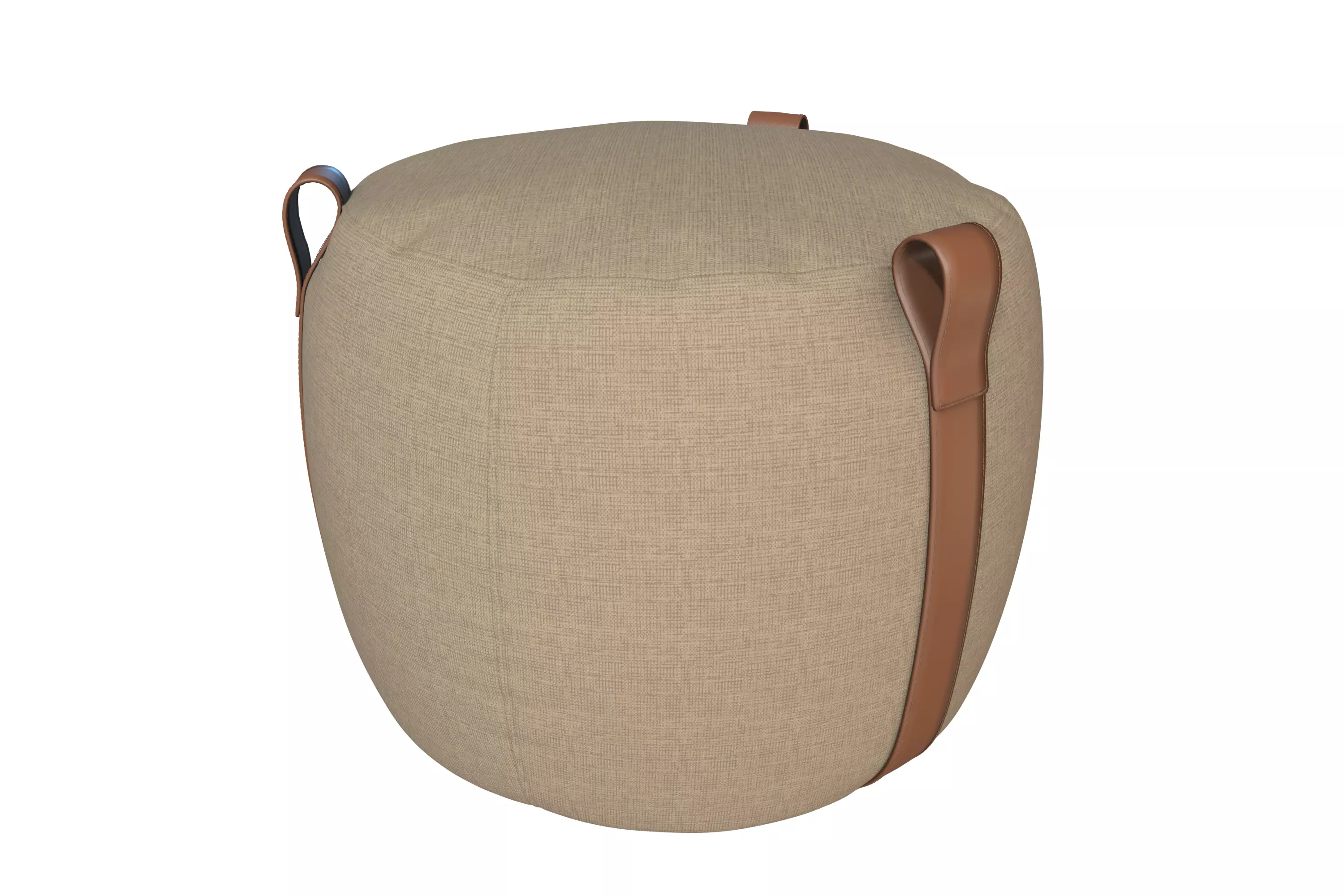 This is a highly detailed PBR (Physically Based Rendering) 3D model of the Lema Notch Pouf, a contemporary and versatile furniture piece. The pouf features a soft, rounded shape upholstered in a neutral-toned fabric, complemented by distinctive natural leather straps that double as stylish handles. This elegant and functional pouf is perfect for adding flexible seating, a footrest, or a decorative accent to modern living rooms, lounges, bedrooms, or reception areas in any architectural visualization.