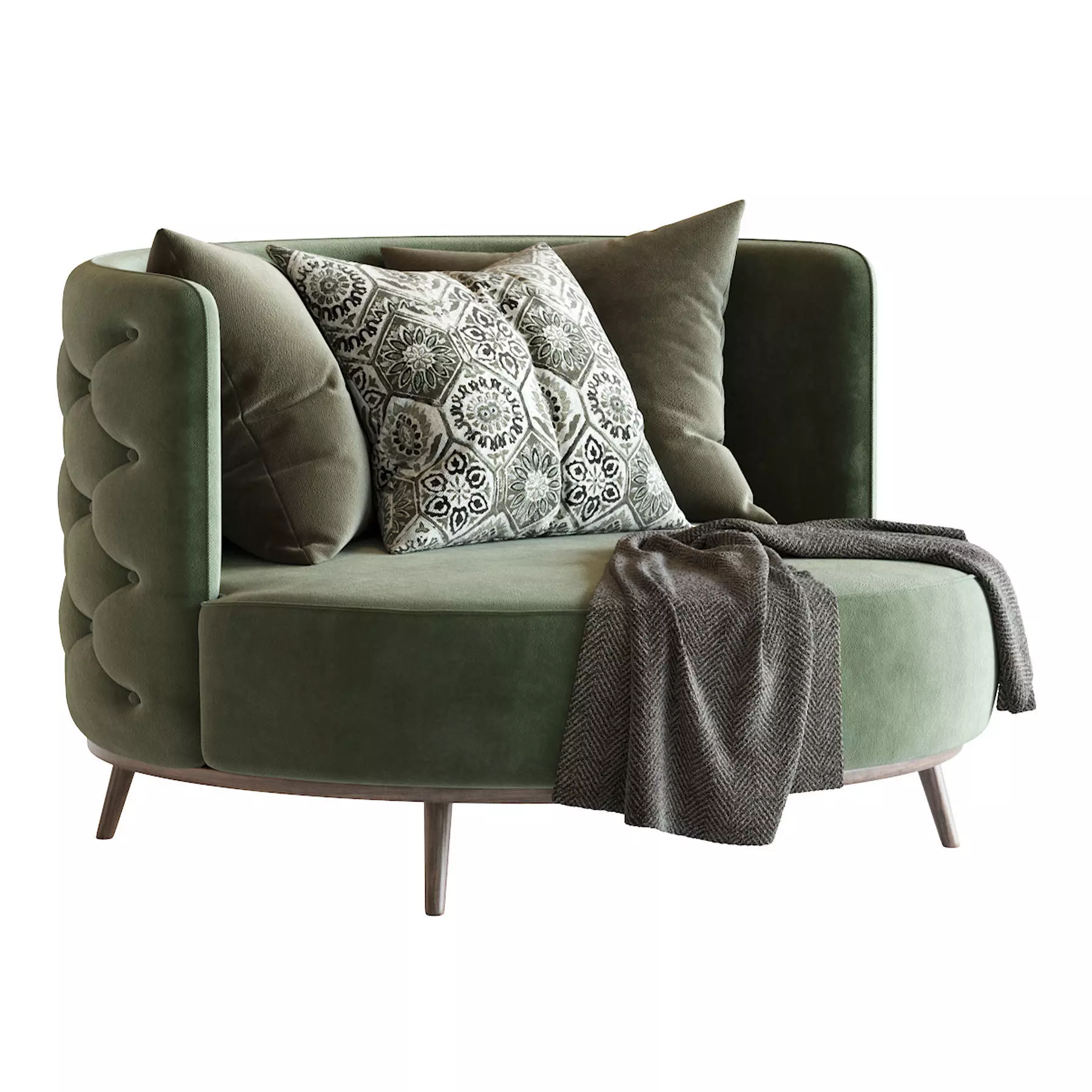 MATERIALS:Upholstery: Green Cotton Velvet, back of the piece in CapitonéLegs: Black LacquerFinishings: High Gloss VarnishPillows: Hexagonal Pattern in Jacquard Fabric