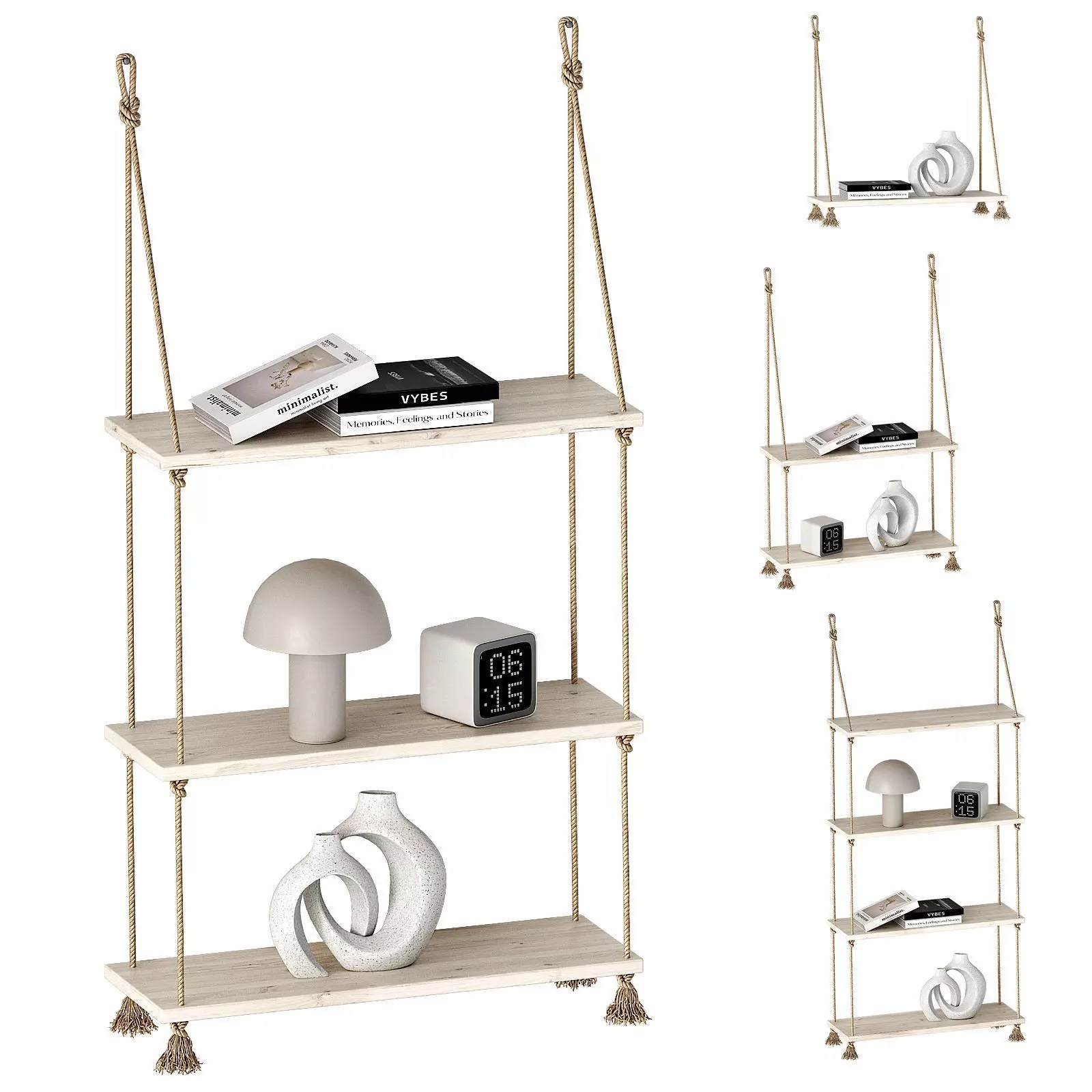3d model contains a set of decorative hanging shelves for the wall, connected with ropes.Original title: Mareo by La redoute