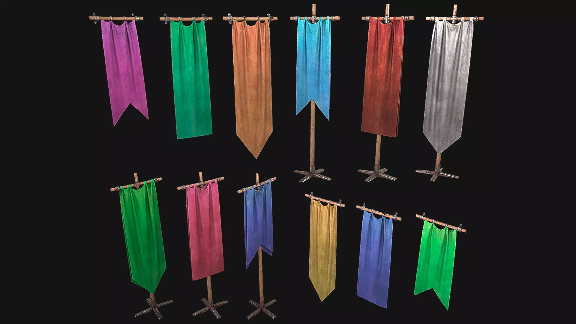 Game ready models .The model contains lods, detailed information on the images.Stylized and detailed Medieval Flag fully textured, sculpted and rendered with Physical based rendering (PBR) - Shown images have been rendered in Marmoset Toolbag .