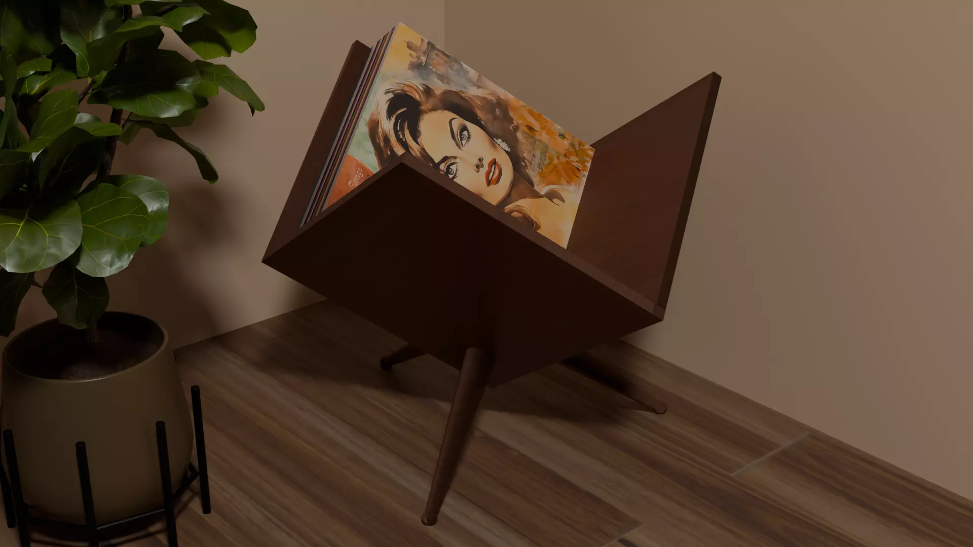 A sleek and stylish 3D model of a classic Mid-Century Modern (MCM) floor-standing vinyl record holder. The storage unit is constructed from three simple wooden boards, forming a geometric, half-cube shape. This holder is mounted on three slender, angled, tapered legs and rests on the floor at a dynamic approximately 45-degree angle, making it an essential decorative and functional accessory for any MCM, Retro, or contemporary visualization scene. It is sized to accommodate standard 12-inch album covers.