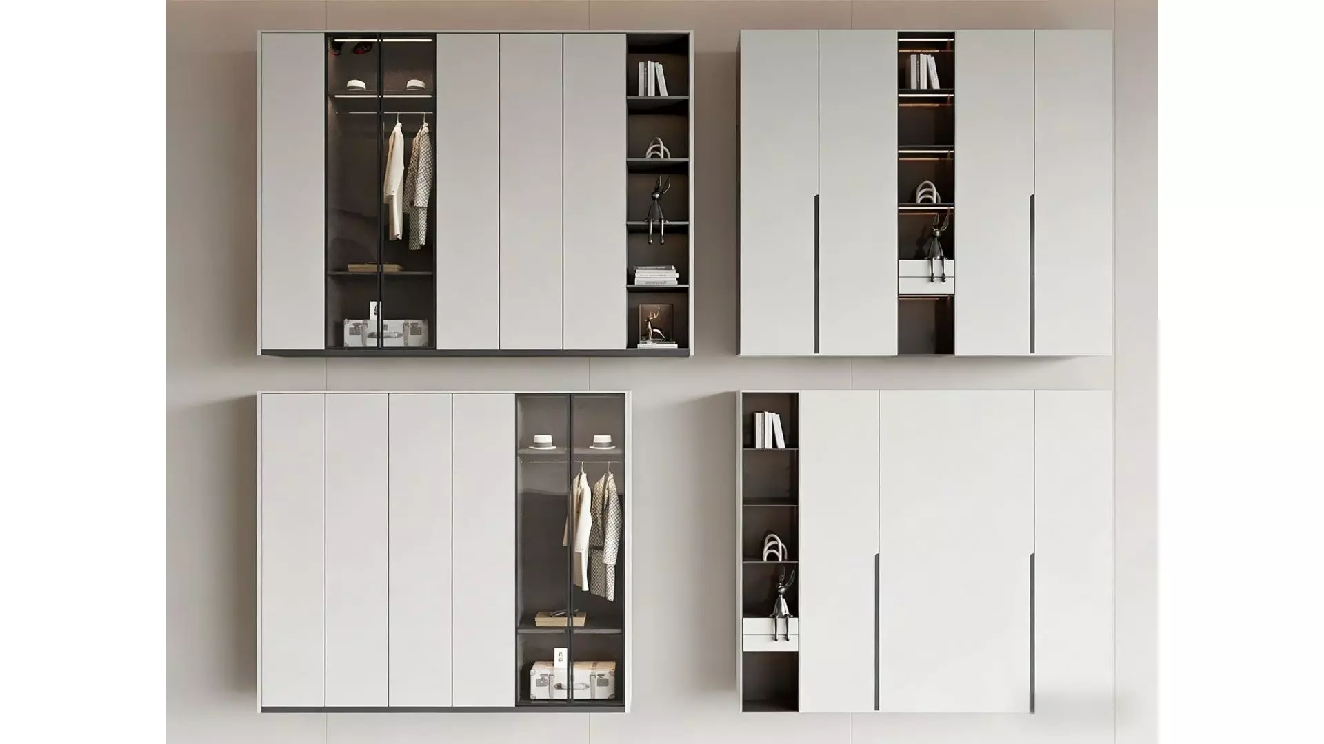 This is a set of modern minimalist hanging wardrobes, featuring a light gray as the main color scheme. It is paired with ultra-minimalist matte cabinet doors and decorated with thin black lines, incorporating glass-door display sections and compartmentalized storage grids. The design strikes a perfect balance between light luxury texture and practical storage functionality.Supporting both built-in and wall-mounted installation methods, these wardrobes are ideal for minimalist and light luxury home spaces. They allow flexible compartmentalization for storing clothes, shoes, bags, and miscellaneous items, achieving a neat visual effect and high space utilization rate.