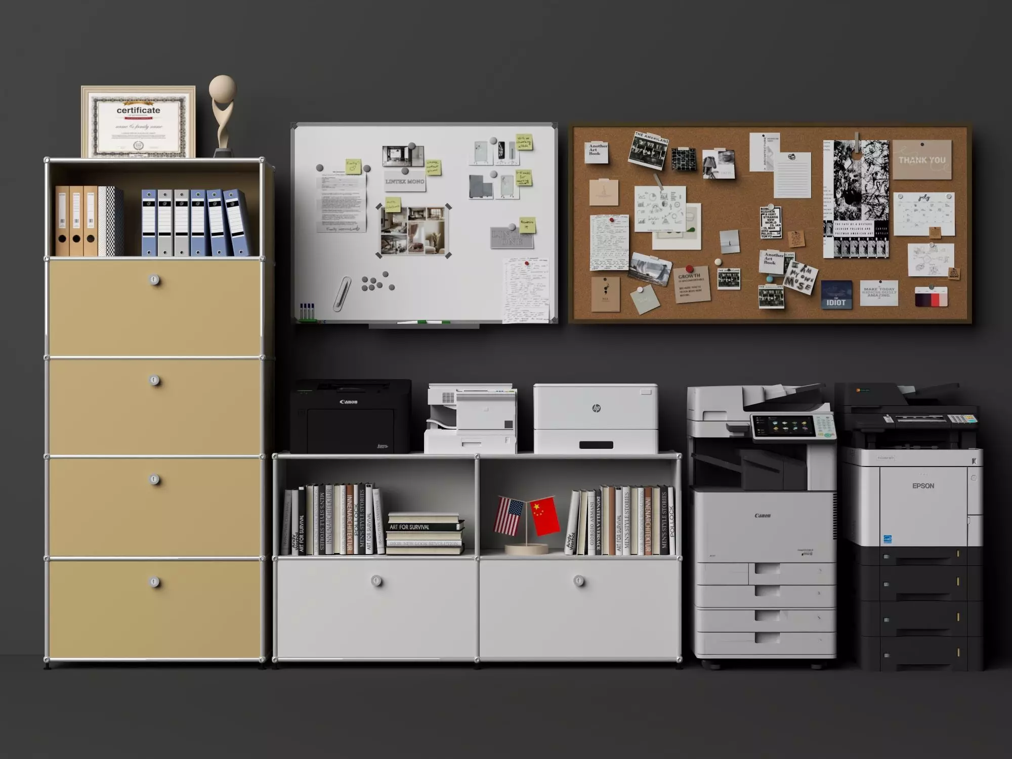 High-quality photorealistic 3D model pack of modern office furniture and equipment. This collection includes modular filing cabinets (beige/gray with glass doors), open shelving units, printers and multifunction copiers from brands like Canon, HP, Epson (desktop laser/inkjet, large floor-standing models with control panels and trays), whiteboard, cork bulletin board with pins/notes/photos, bookshelves with books, certificate frame, trophy, small flags (US/China), paper stacks, and decorative elements for realistic office setups.Perfect for architectural visualization, office interior rendering, corporate scene creation, product mockups, game environments (Unity/Unreal Engine), VR/AR projects, or workplace animations.Key features: