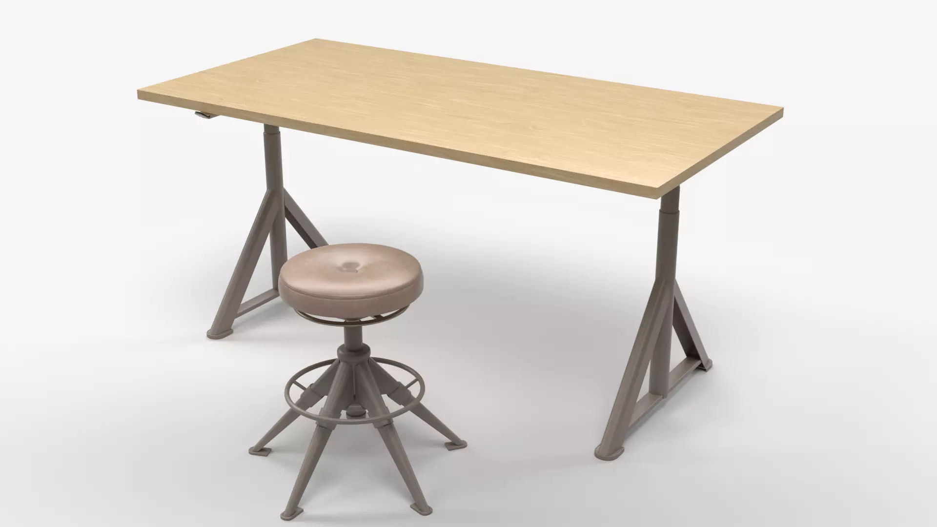 This high-quality 3D model features a modern industrial workspace setup, including a natural wood tabletop desk supported by sturdy A-frame metal legs and a vintage-style adjustable workshop stool.