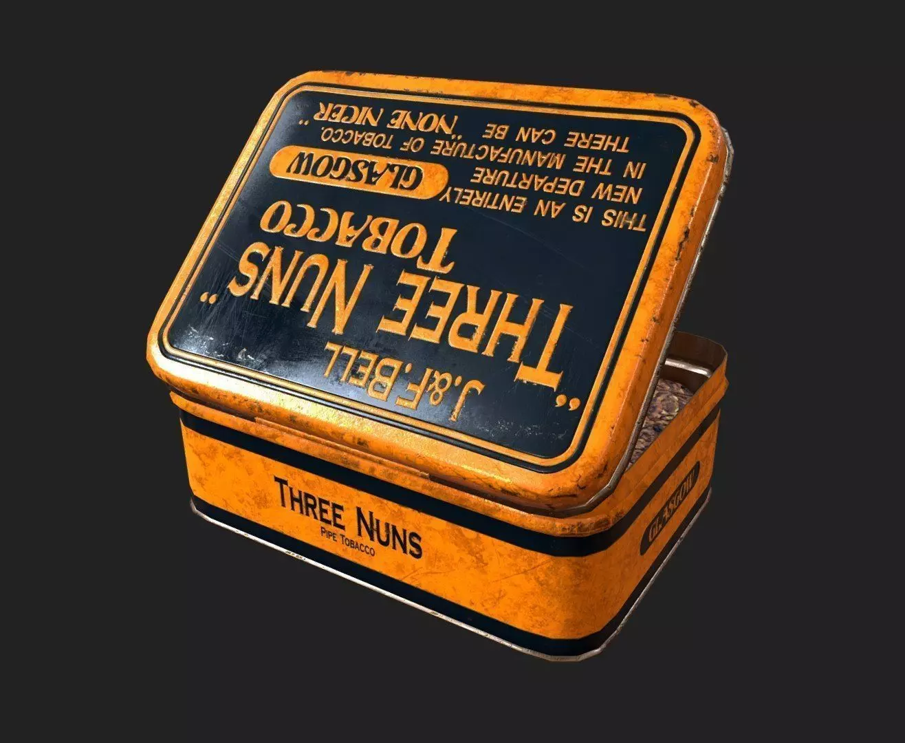 Lowpoly game-ready Three Nuns tobacco tin textured with Quixel Suite. Download files include full resolution textures up to 4K, FBX, OBJ, 3DS, FLT and DAE formats.Check out the full project: https://www.cgtrader.com/3d-models/furniture/other/ultimate-pipe-smoking-set