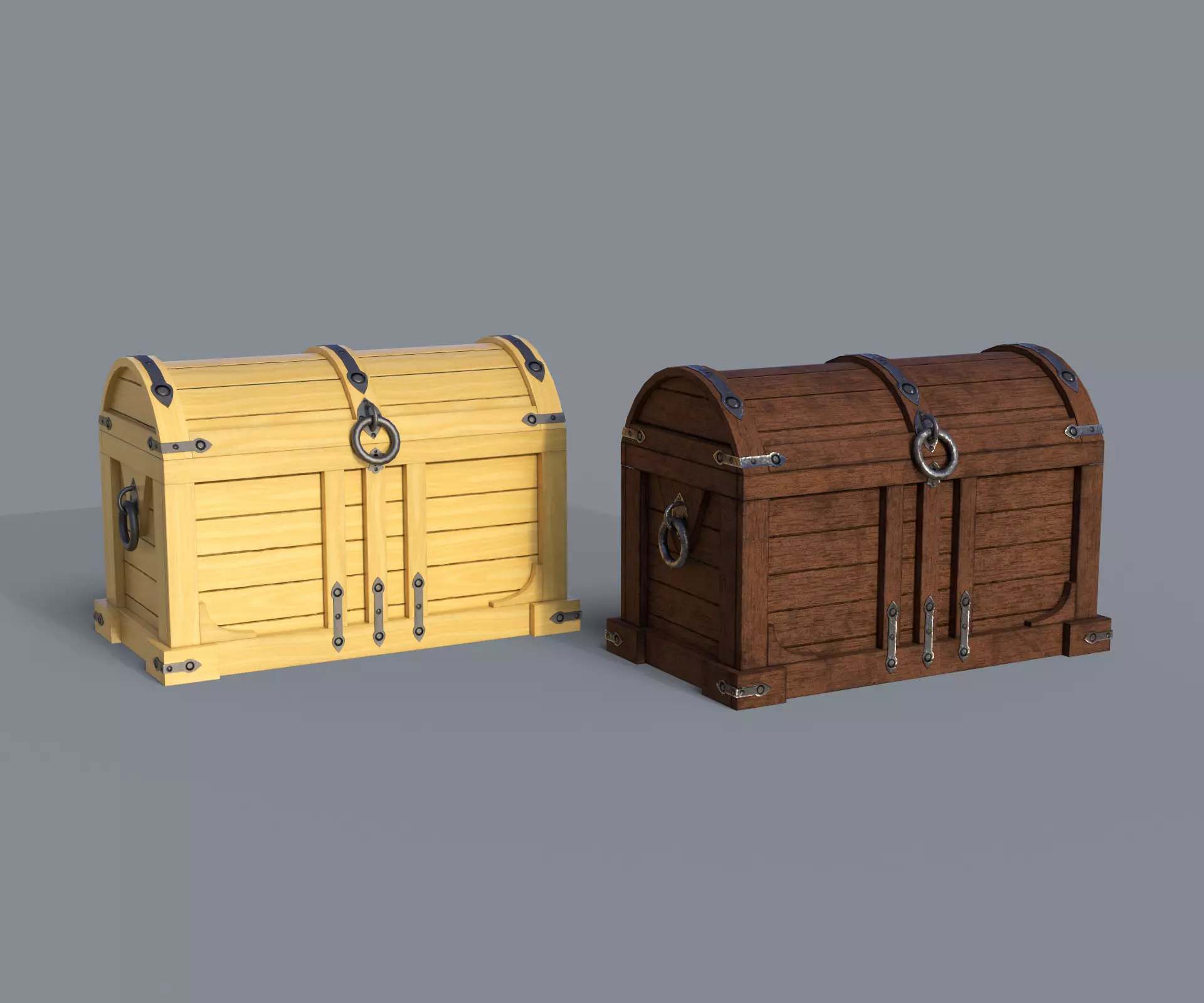 Hello! This is a 3D model of a treasure chest.The archive contains 2 models of the chest: pine and brown. Each one is on the stage separately. The model consists of 5 objects: the lid, the box and 3 separate rings. The lid and the rings have the origine centre in the right places, for the rotation animation (the models have no animation!).