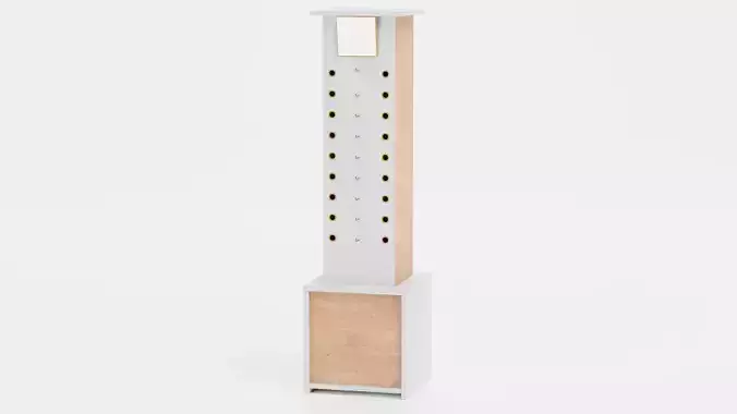 A compact eyewear stand that combines storage, display, and subtle functionality in a single, balanced form. The dual-sided layout uses hooks and precision slots to present glasses and sunglasses in a clear, organized way, while the integrated top mirror adds a natural point of interaction. The mix of white surfaces and wood accents gives the stand a contemporary, neutral character that works seamlessly in retail setups, interior scenes, and product mockups. Designed with clean geometry and brand-free aesthetics, the model is ready to integrate into a wide range of visual contexts.