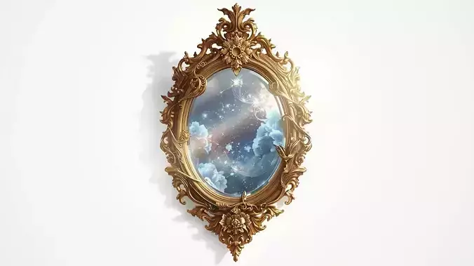 Peer into realms unknown with this enchanting Ornate Golden Magical Mirror 3D Model! This breathtaking asset showcases a beautifully crafted, highly detailed baroque-style frame, finished in a lustrous antique gold. The frame is intricately carved with swirling rococo motifs, delicate floral patterns, and elegant flourishes, exuding opulence and ancient mystique.