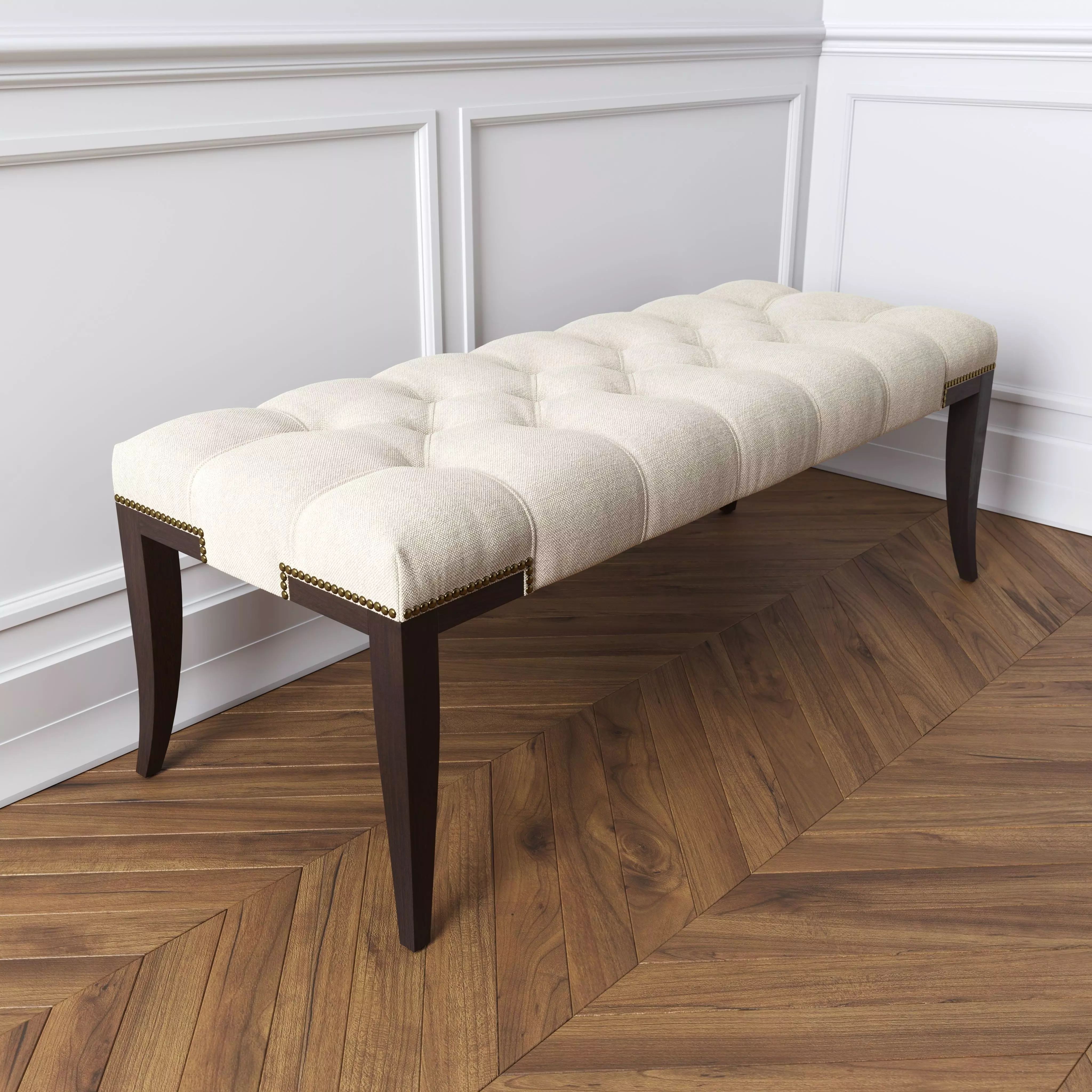Warranty: 24 monthsCollection: MESTRESize: 124.2 * 48 * 45 Description:An extravagant cream-colored ottoman on high legs looks strong and modern. A magnificent Neoclassic style product bears greatness through a combination of light upholstery and a dark base. The duet of contrasting colors fills the room with energy, makes it lively and easy. Only one piece of designer furniture from the MESTRE collection can transform space.