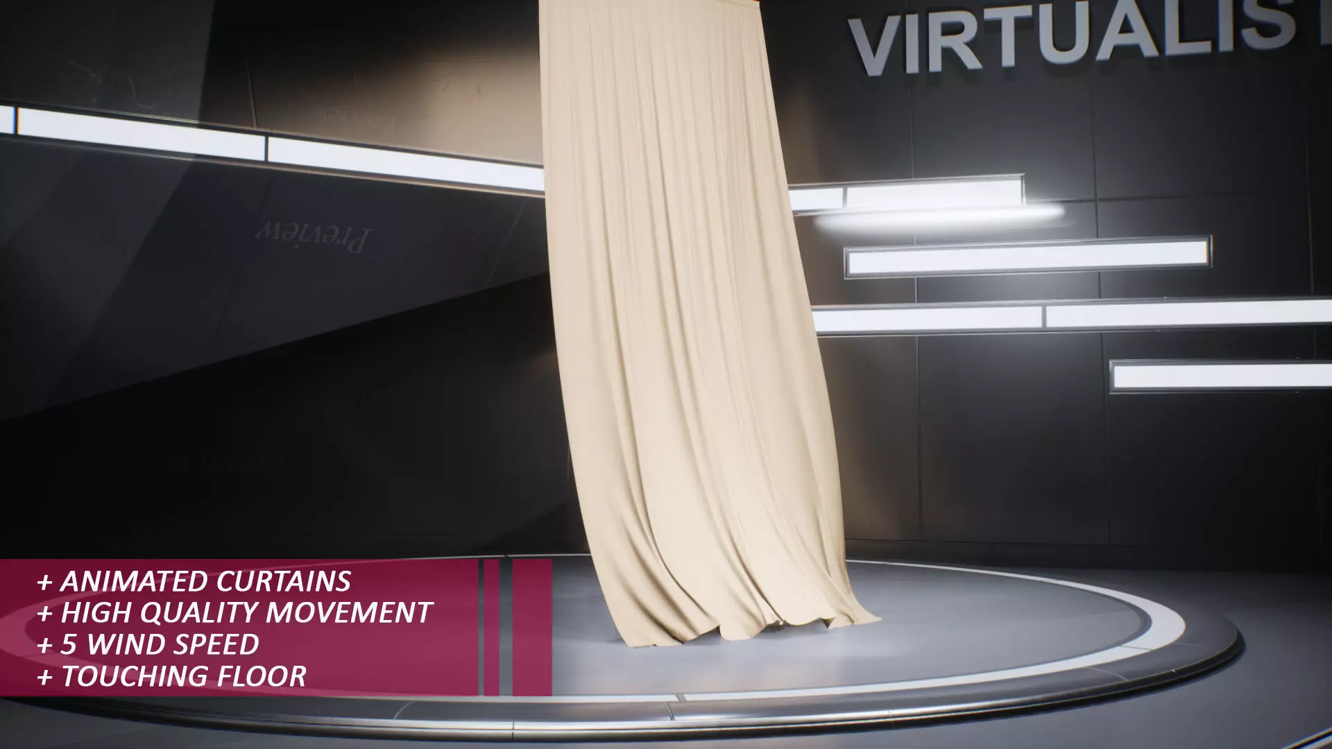 Pack of High quality Animated Curtains Blowing in five types of Wind: 1- Very slow wind; 2- Slow Wind; 3-Moderate wind; 4- Strong wind; Very Strong wind.The curtain is touching the floor. The geometry of the five curtains is identical. it's composed of three parts (Material ID) for easy texturing in the software of your choice. Simulated in Marvelous Designer over 1000 frames (About 35 seconds long) 30 frames per Second for perfect smooth curtain movement.Wind direction: perpendicular to the curtain. Wind force: Very slow (2mph) Slow (4 mph) + Moderate (7 mph) + Strong (11 mph) + Very Strong (14 mph). High resolution 3D model for a very smooth animation (Expect Large format files). Ready for animation, games, VR / AR projects, and Photorealistic renders.Available in these file format : FBX, MCX file, OBJ, Alembic (ABC), Collada (DAE), Marvelous Designer 11 file. Interior scene not included (just for presentation) To see the full movement of the curtain in different wind speeds, please take a loot at the attached Youtube Video link.For other types of animated curtains please check my profile.