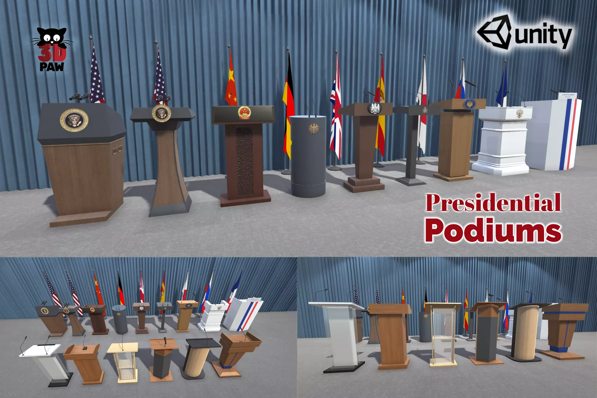 Collection of 25 models with presidential podiums of different countries with their corresponding flags and other podiums for general use. The podiums or lecterns have different materials: wood, plastic, metal and glass. All models are accurately scaled to represent real-life object's dimensions. The pack is ready to be used in 3D projects or games. The models are low poly. Made in a Unity LTS version.
