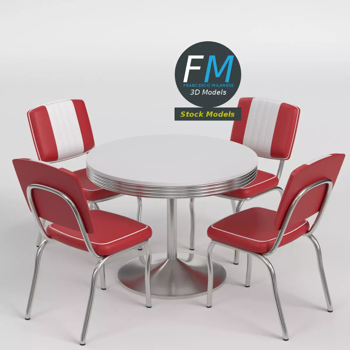 A classic retro diner furniture set featuring a round chrome table and four red-and-white vinyl chairs, presented as 3D Models ideal for vintage interiors, American diners, cafés, and stylized game or visualization scenes; nr. 1 in my collection. 5 individual objects (4 chairs, 1 table), sharing the same non overlapping UV Layout Map, Material, and PBR Textures set. Production-ready 3D Model with non overlapping UV Layout map provided in the package. PBR Materials and Textures (Metallic Workflow: Base Color, Metallic, Roughness, Normal) embedded in the Blend, FBX, and GLB files.Easily customizable: UV unwrapped geometries; UV Layout maps provided in the package as png with alpha images.Quads-only geometry.Made with Blender 4.5 with Cycles Principled BSDF (PBR, Metallic Workflow) Material, then exported to other formats (OBJ, FBX, GLB; FBX and GLB have embedded textures).Promo images: some renderings made with Cycles for Blender, plus Wireframes and Blender screenshots (Object Mode, Edit Mode with UVs).Formats included: FBX with embedded PBR Textures (Metallic Workflow: Base Color, Metallic, Roughness, Normal), GLB with embedded PBR Textures (Metallic Workflow: Base Color, Metallic, Roughness, Normal), OBJ; scenes: BLEND (with Cycles Principled (PBR) Materials); other: 16-bit PNGs with Alpha.5 Objects (meshes), 1 PBR Material, UV unwrapped (non overlapping UV Layout map provided in the package).UV Layout maps and Image Textures resolutions: 2048x2048.Polygonal, QUADS-ONLY, 46204 vertices, 46168 quad faces (92336 tris).Real world dimensions; scene scale units: METERS in Blender 4.5 (that is: Metric with 1.00 scale).Uniform scale object (scale applied in Blender 4.5).PBR Textues included: in a zipped folder, you'll find the PBR Textures set (as 16-bit PNGs with Alpha).IMPORTANT --- Main renderings made with Blender 4.5 + Cycles using an HDR Environment Texture Image which is NOT provided in the package!