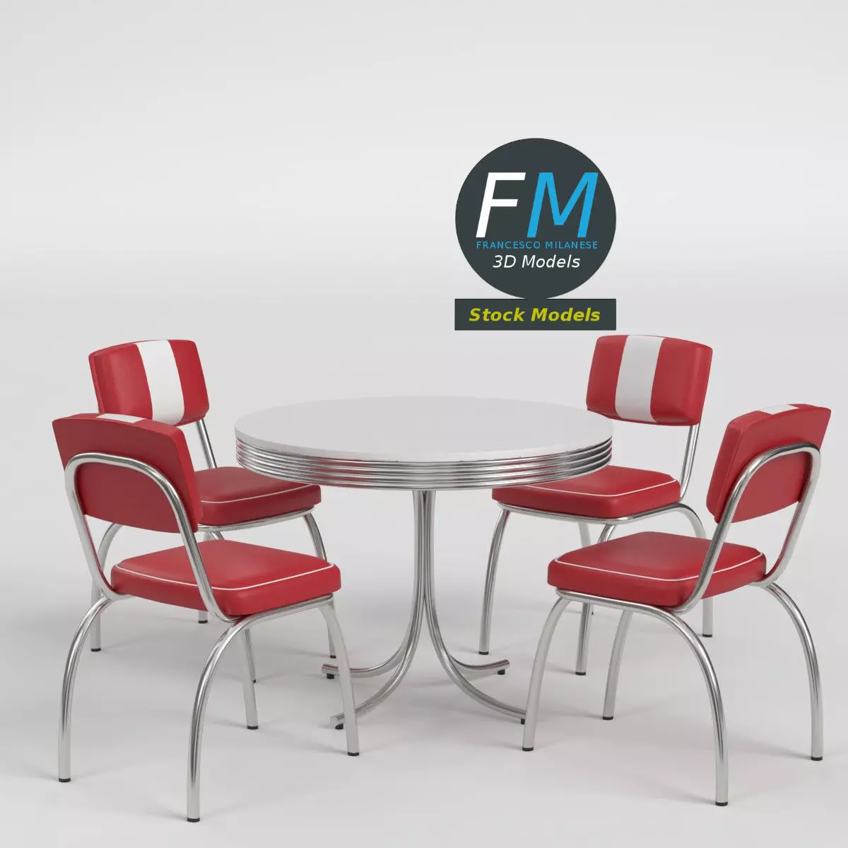 A classic retro diner furniture set featuring a round chrome table and four red-and-white vinyl chairs, presented as 3D Models ideal for vintage interiors, American diners, cafés, and stylized game or visualization scenes; nr. 2 in my collection. 5 individual objects (4 chairs, 1 table), sharing the same non overlapping UV Layout Map, Material, and PBR Textures set. Production-ready 3D Model with non overlapping UV Layout map provided in the package. PBR Materials and Textures (Metallic Workflow: Base Color, Metallic, Roughness, Normal) embedded in the Blend, FBX, and GLB files.Easily customizable: UV unwrapped geometries; UV Layout maps provided in the package as png with alpha images.Quads-only geometry.Made with Blender 4.5 with Cycles Principled BSDF (PBR, Metallic Workflow) Material, then exported to other formats (OBJ, FBX, GLB; FBX and GLB have embedded textures).Promo images: some renderings made with Cycles for Blender, plus Wireframes and Blender screenshots (Object Mode, Edit Mode with UVs).Formats included: FBX with embedded PBR Textures (Metallic Workflow: Base Color, Metallic, Roughness, Normal), GLB with embedded PBR Textures (Metallic Workflow: Base Color, Metallic, Roughness, Normal), OBJ; scenes: BLEND (with Cycles Principled (PBR) Materials); other: 16-bit PNGs with Alpha.5 Objects (meshes), 1 PBR Material, UV unwrapped (non overlapping UV Layout map provided in the package).UV Layout maps and Image Textures resolutions: 2048x2048.Polygonal, QUADS-ONLY, 23858 vertices, 23808 quad faces (47616 tris).Real world dimensions; scene scale units: METERS in Blender 4.5 (that is: Metric with 1.00 scale).Uniform scale object (scale applied in Blender 4.5).PBR Textues included: in a zipped folder, you'll find the PBR Textures set (as 16-bit PNGs with Alpha).IMPORTANT --- Main renderings made with Blender 4.5 + Cycles using an HDR Environment Texture Image which is NOT provided in the package!