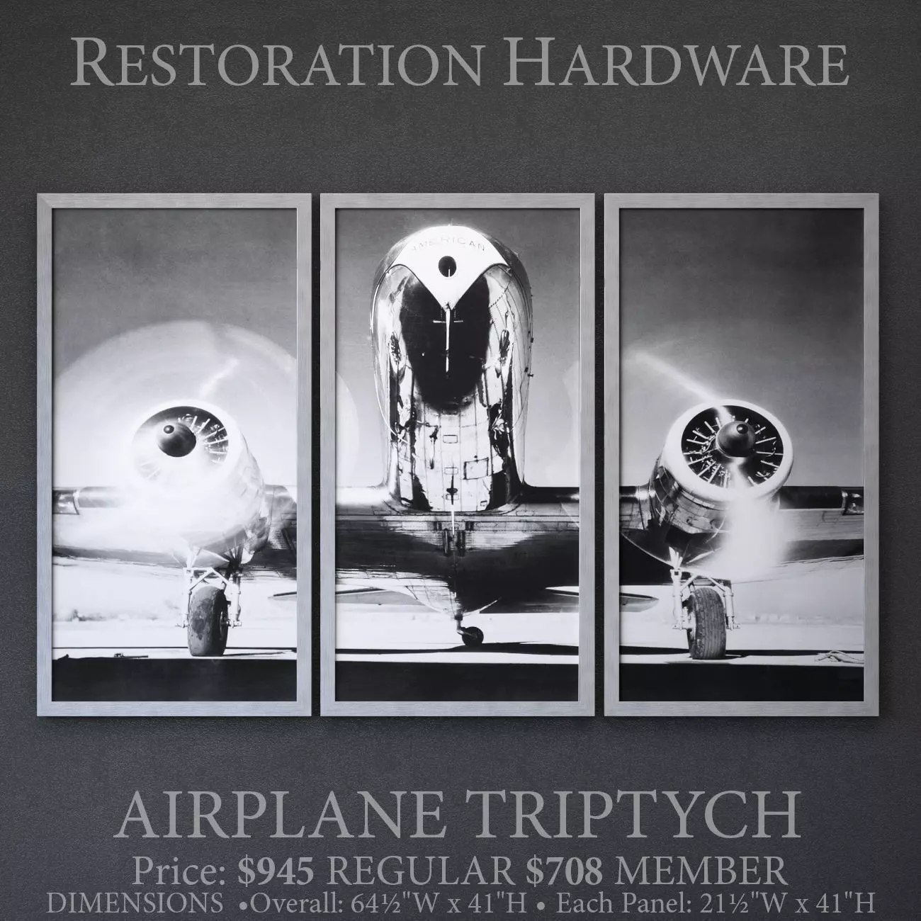 Restoration HardwareAIRPLANE TRIPTYCHArchives included: textures, materials (vray),3DS, FBX, OBJ, 2011 max, 2014 max scene.Model was created in 3ds Max 2014.Shader for V-Ray 3.30.05