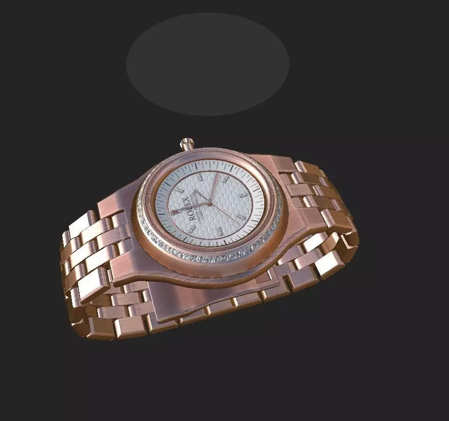 The watch in the photo has a luxurious style with a prominent rose gold tone. The case and metal strap are designed to be glossy, creating a high-class and sophisticated feel. The watch face has a light mesh pattern, combined with a sparkling stone border to make the overall look more prominent. The light reflected on the metal links increases depth and authenticity, suitable for making 3D products or promotional concepts.