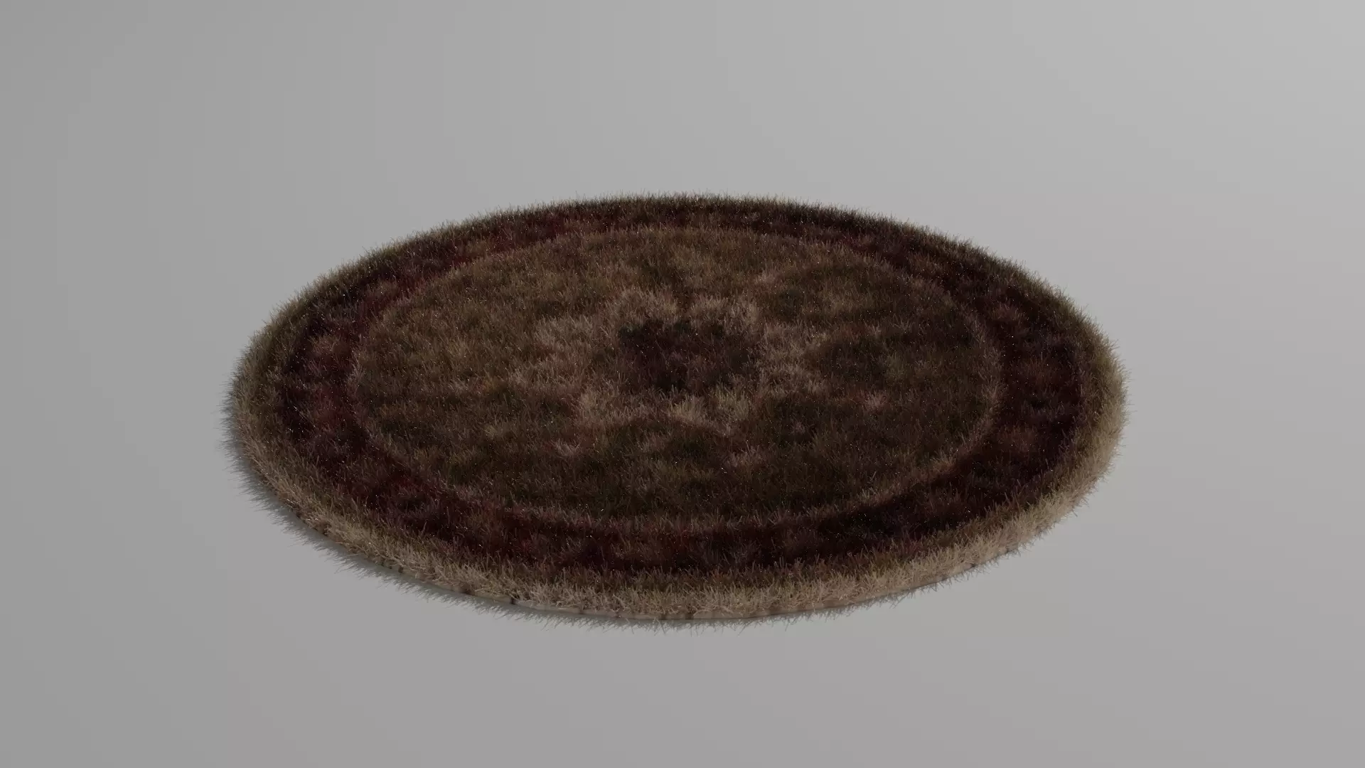 A particle system with 500000 hairs was used to make the carpet furs. With a Brownian value of 0.010 to slightly curl the hairs. The hairs have a texture that is the same as the base but with added transparency. The length of the hairs is 0.02m. Diameter root and Tip are 0.1 m. The tips are closed. Strand steps value is 2. B-spline is activated and the steps have a value of 2A vertex group has been used. Children have not been used.