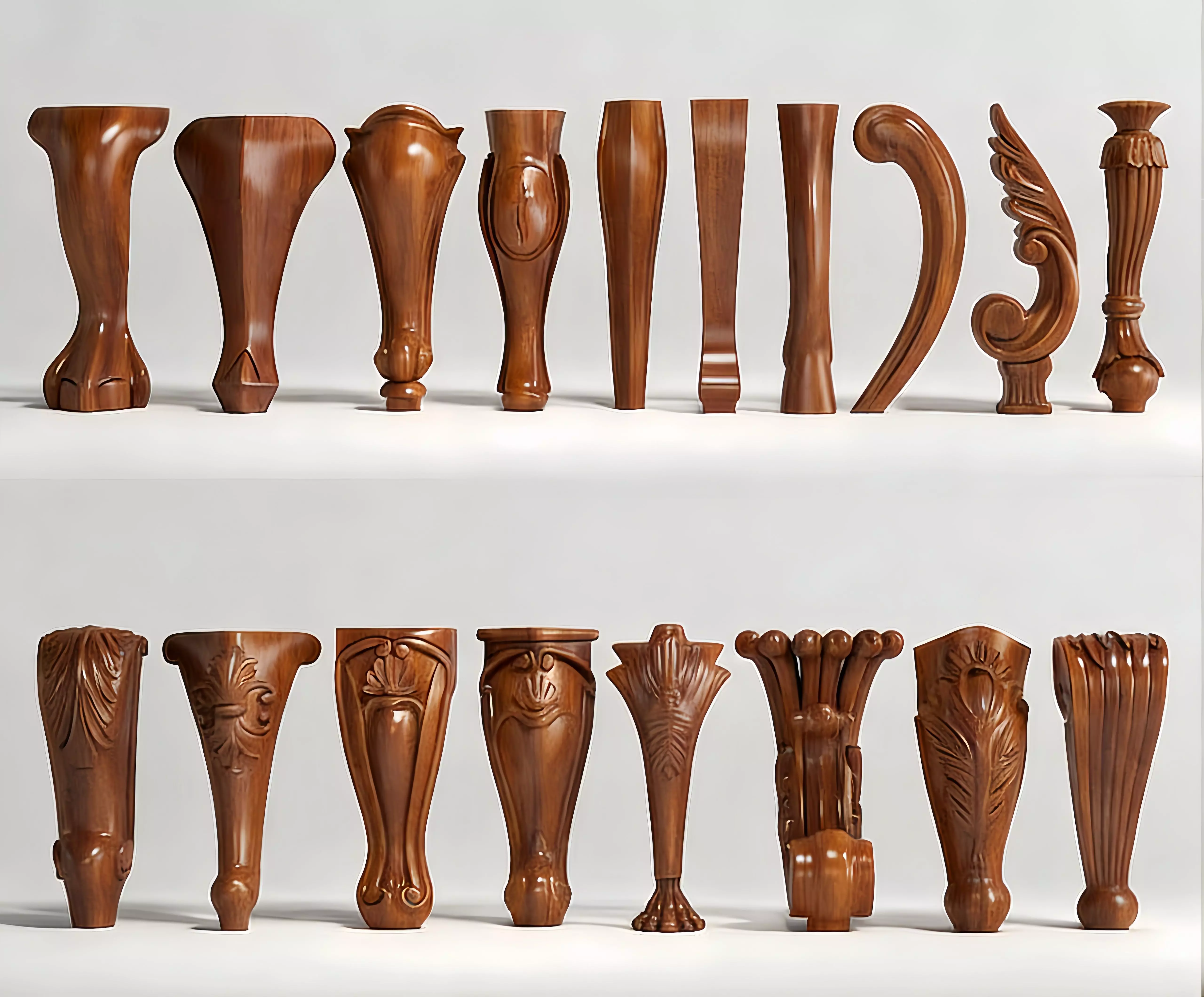 This is a collection of classic European-style furniture legs made of solid wood, featuring a variety of shapes and carved patterns, mainly used for supporting and decorating furniture such as sofas, dining tables, sideboards, and coffee tables.Material: Mostly reddish-brown solid wood with clear grain and a warm, heavy texture.Style: Includes classic designs like claw feet, gourd-shaped legs, scroll carvings, leaf-patterned carvings, columnar styles, curved leg styles, etc., full of a retro palace charm and the artistry of hand-carved woodwork.Application: Serves as both a supporting component and a decorative element for furniture, enhancing the luxurious feel and classical elegance of the pieces, and is suitable for European, American, neoclassical, and other home decor styles.Craftsmanship: Primarily crafted from solid wood carvings, with smooth lines and exquisite details. Some styles feature three-dimensional reliefs and curved silhouettes, combining practicality with decorative appeal.
