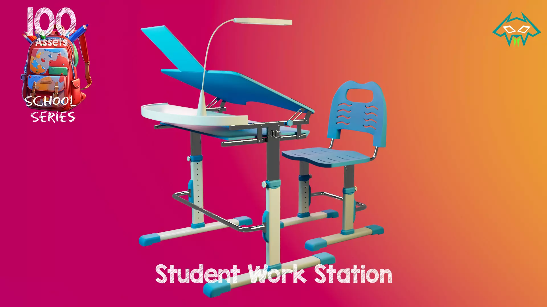 A 3d model of adjustable study desk and chair set, designed for ergonomic comfort and flexibility. The desk features a tilt-adjustable surface, allowing for different angles of use, which is predominantly in a vibrant blue color. The tabletop includes a flat section for placing items that need to remain horizontal. The desk frame is constructed with a combination of white and metallic elements, providing a sturdy base. Additionally, the desk has a white lamp attached for task lighting. The chair, coordinated in style and color, has a contoured blue backrest and a matching blue seat, both designed for comfort. The legs and supports of the chair mimic the desk's construction, using the same color and material scheme. Includes a Maya file, fbx, and a Blender file. it has clean topology, it has 4k textures, it uses udim workflow, textures are pbr textures, all models are low poly and sub-dividable.