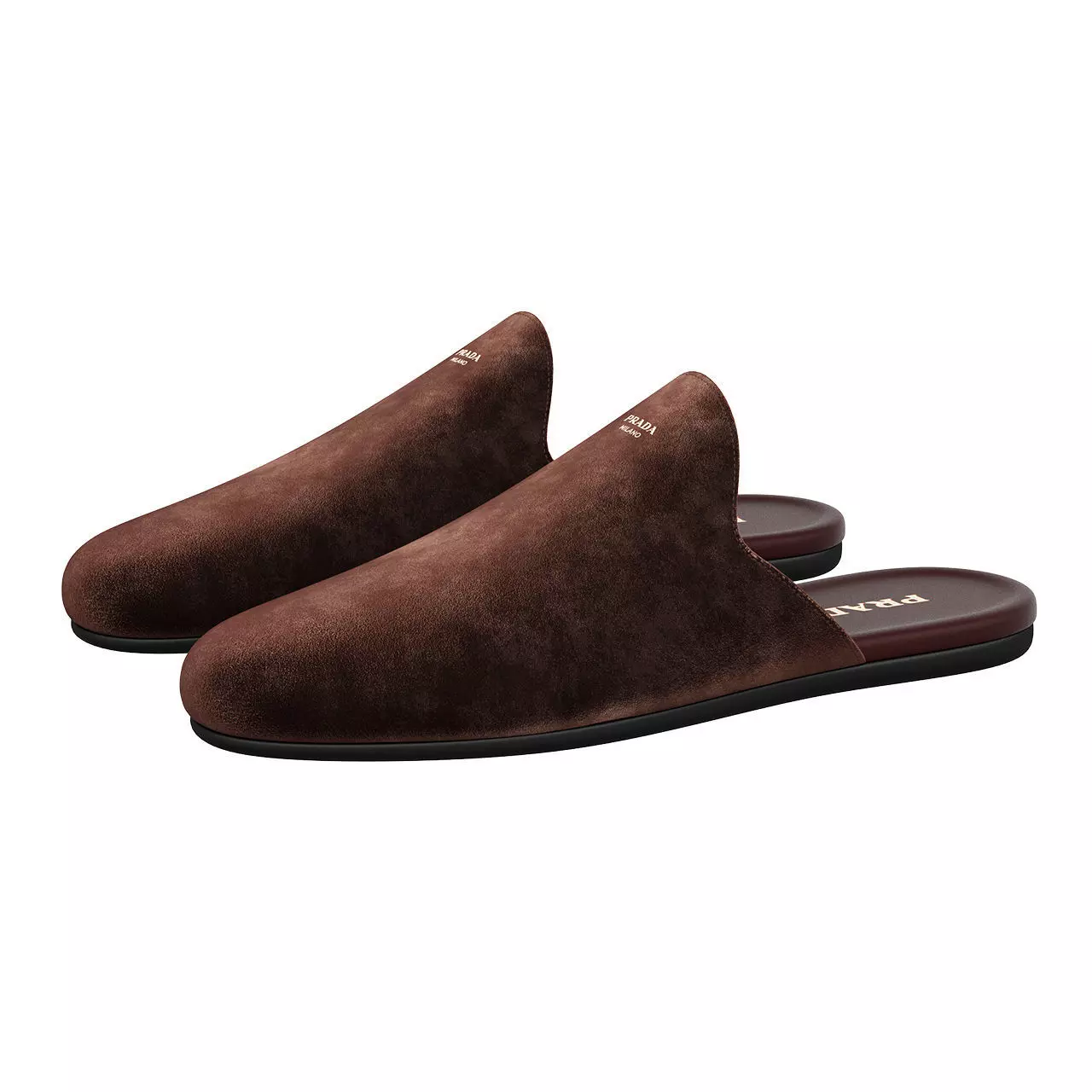 3d model Suede Women Slippers by Prada. Suede Women Slippers by Prada can elevate interior styling by adding a refined, fashion-forward accent to residential or hospitality spaces. Crafted from soft suede with a minimalist silhouette, they convey understated luxury and attention to material quality. These slippers are ideal for use in bedroom scenes, walk-in closets, or high-end lifestyle visualizations, contributing warmth, comfort, and a sense of everyday elegance. Their clean lines and muted texture help balance modern interiors while subtly reinforcing a premium atmosphere. Dimensions of the slippers: H 9 x L 28 x D 10 cm / H 3.54 × L 11.02 × D 3.94 inches. The Vray, Corona, and Blender files come with materials in place, ready to render.