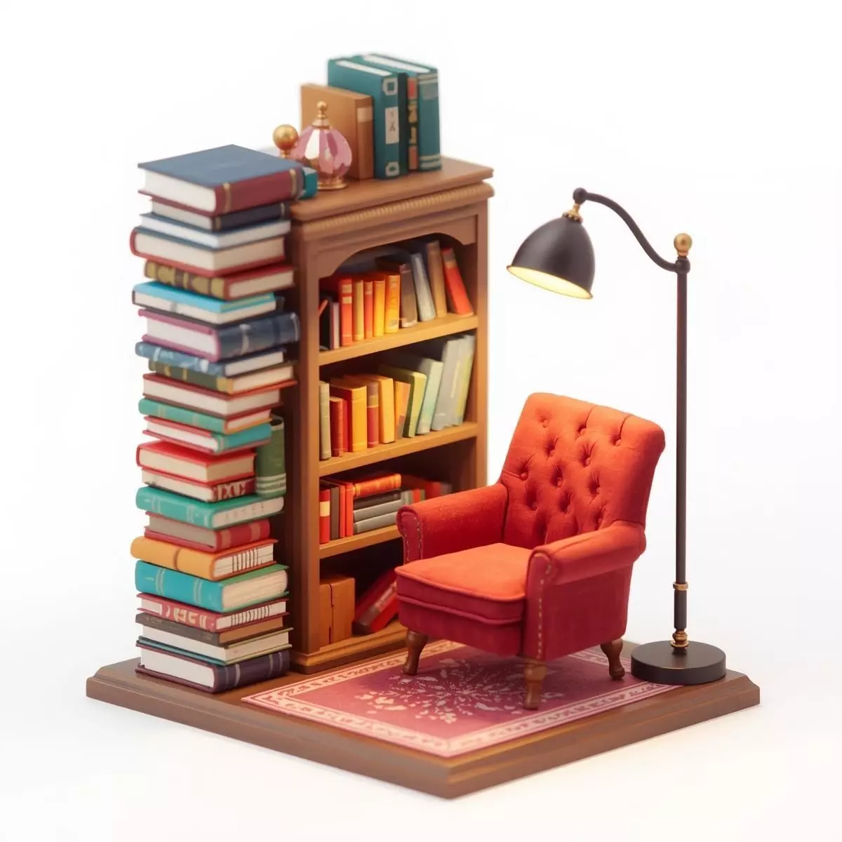 Tags3d model library corner stylized diorama game ready prop velvet armchair colorful books reading nook bookshelf asset warm lighting miniature library whimsical aesthetic office prop study room interior asset isolated prop pbr materials cozy decor