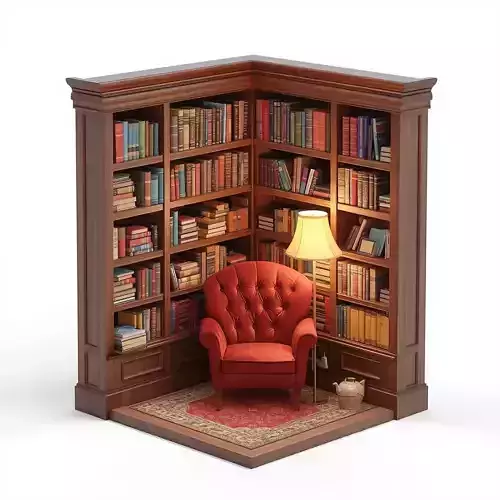 Tags3d model library corner stylized diorama game ready prop velvet armchair colorful books reading nook bookshelf asset warm lighting miniature library whimsical aesthetic office prop study room interior asset isolated prop pbr materials cozy decor