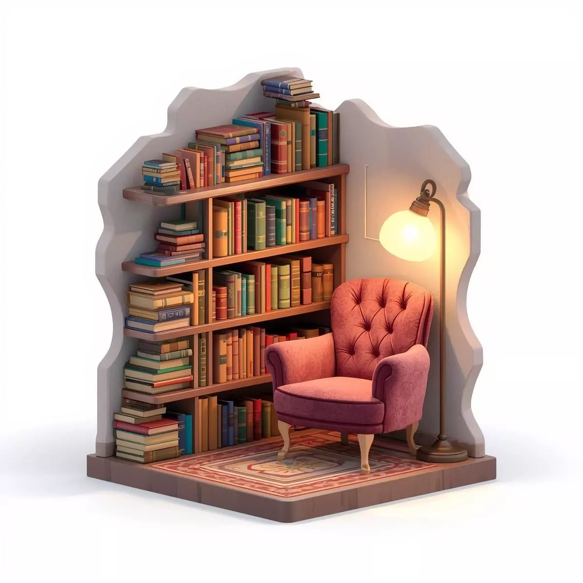 Tags3d model library corner stylized diorama game ready prop velvet armchair colorful books reading nook bookshelf asset warm lighting miniature library whimsical aesthetic office prop study room interior asset isolated prop pbr materials cozy decor
